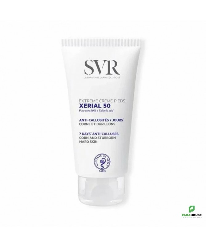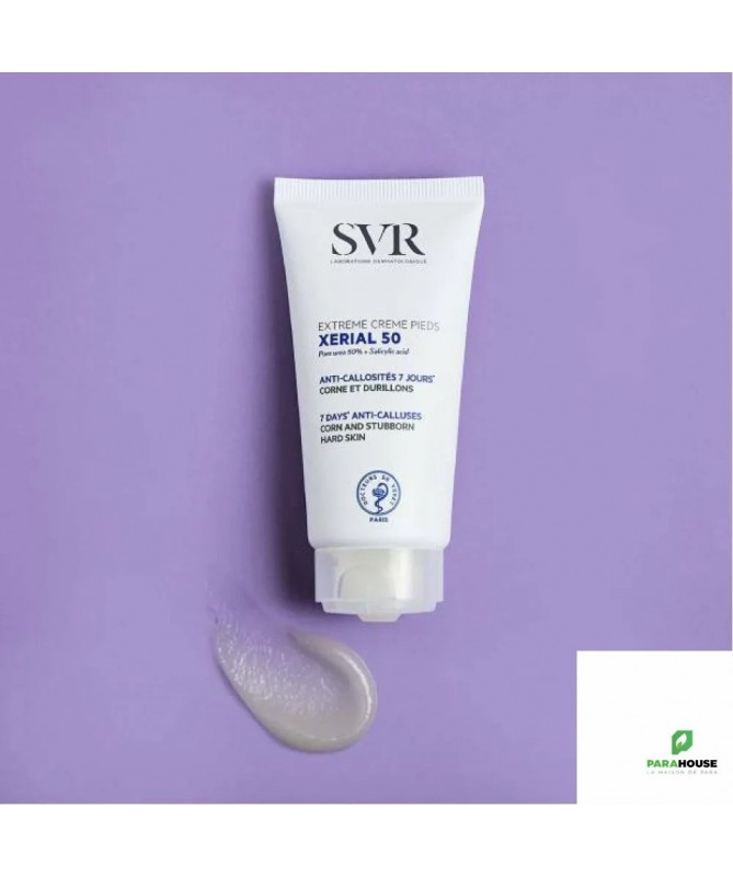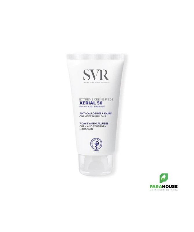 SVR XERIAL 50 EXTREME CREME PIEDS ANTI CALLOSITES SVR Xérial 50 est une crème qui réduit efficacement les callosités et les durillons rebelles présents sur les pieds, et ce, en un temps record : 7 jours. En effet, grâce à sa composition : technologie Urée pure concentrée à 50%, protéase, acides aminés et acide salicylique, Xérail 50 extrême est capable d'éliminer en une semaine les callosités et les durillons rebelles des pieds et ainsi rendre la peau lisse et souple. Composition : INCI : 090116 - INGREDIENTS (CONTAINS) : UREA . AQUA (PURIFIED WATER) . GLYCERIN . BUTYROSPERMUM PARKII BUTTER (SHEA BUTTER) . TRIETHANOLAMINE . ISOHEXADECANE . SALICYLIC ACID . OCTYDODECANOL . POLYACRYLATE-13 . BACILLUS FERMENT . SERINE . HISTIDINE . OCTYLDODECYL XYLOSIDE . PEG-30 DIPOLYHYDROXYSTEARATE . POLYISOBUTENE . POLYSORBATE 20 . SORBITAN ISOSTEARATE . PROPYLENE GLYCOL . DISODIUM EDTA . CITRIC ACID . POTASSIUM SORBATE Testé sous contrôle dermatologique et podologique. Emulsion E/H. Sans parfum. Sans paraben. Conseils d'utilisation : Pour un effet visible dès une semaine d'application, il est primordial d'appliquer cette crème sur les zones concernées quotidiennement. Pour que ces callosités et durillons rebelles ne reparaissent plus vous pouvez utiliser en plus de cette crème une crème préventive comme SVR Xérial 30. Toutefois, faites attention, cette crème est déconseillée aux moins de 3 ans. Callosités, corne et durillons, peds très rugueux et épaissis SANS PARFUMTEXTURE GELIFIEE : Non grasse, elle s’étale facilement et pénètre rapidement. Il se peut que sa texture cristallise à la fin du tube. Cela n’altère pas son efficacité ni sa bonne tolérance, c’est simplement la texture qui se modifie. TESTE SOUS CONTROLE DERMATOLOGIQUE TESTE PERTURBATEURS ENDOCRINIENS
