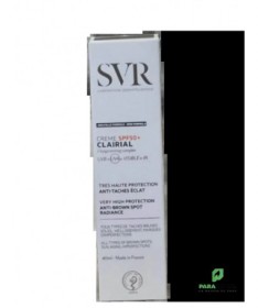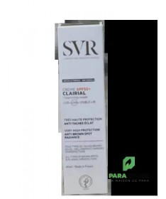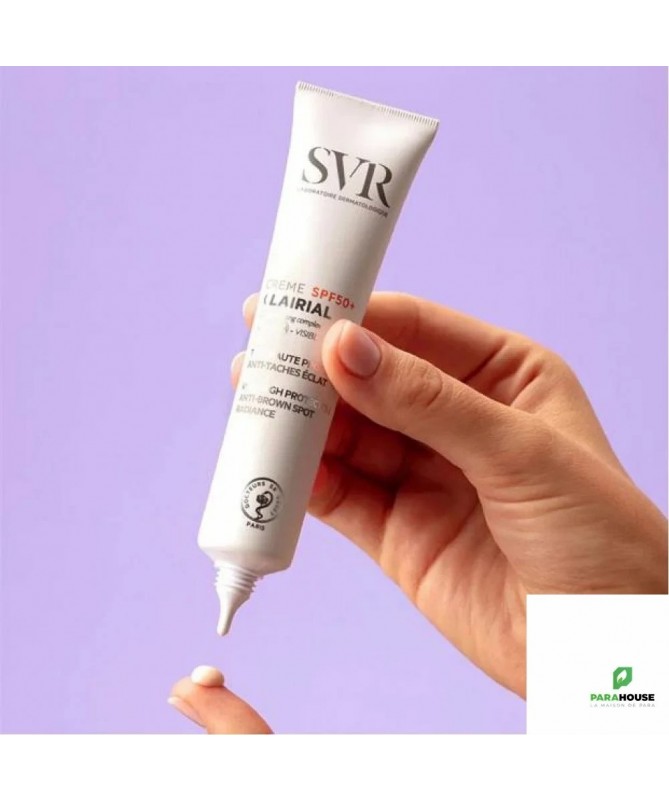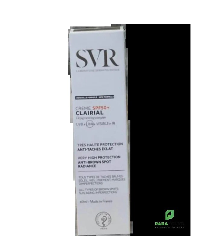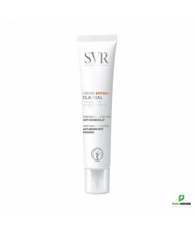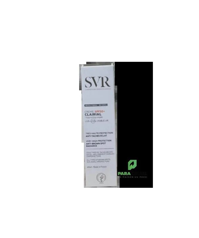 SVR CLAIRIAL CREME SPF50+ 40ML SVR CLAIRIAL CREME SPF50+ est une crème très haute protection solaire anti-taches. CLAIRIAL svr SPF50+ est un soin anti taches 2-en-1 qui corrige et prévient l’apparition des taches brunes. Réduit la taille des taches et améliore l'uniformité du teint dès 28 jours. Brevet Solaire SVR efficace sur les UVB + UVA + VISIBLE + INFRAROUGES. Creme Svr clairial est destinée pour toutes les peaux sensibles. Pour tous types de taches brunes liées au soleil, au vieillissement cutané, à la grossesse, au teint irrégulier, aux marques d’imperfections. Visage, décolleté, mains. Adultes. La nouvelle formule 2-en-1 de Clairial creme SPF50+ associe un complexe dépigmentant pour corriger et prévenir tous les types de taches brunes, à une très haute protection solaire large spectre contre les UVB, renforcée contre les UVA et un complexe anti-oxydants contre la lumière visible et les infrarouges. La Crème SPF50+ Clairial a été reformulée pour respecter toujours mieux la peau et la planète : Brevet(3) Solaire SVR : 4 années de recherche pour inventer l’association filtrante idéale qui délivre à la fois une très haute protection solaire dermatologique UVB + UVA + VISIBLE + INFRAROUGES tout en respectant l’environnement marin. Sans compromis sur l’efficacité et la sensorialité ! Son nouveau tube au format canule pour une application facile est composé à 50% de plastique recyclé et 100% recyclable. DES ACTIFS DERMATOLOGIQUES DE RÉFÉRENCE : Brevet(3) Solaire SVR : très haute protection solaire dermatologique respectueuse de l’environnement marin, protège de tous les types de rayons, UVB + UVA + VISIBLE + INFRAROUGES, des taches et marques dues aux UV et à la lumière bleue. Protection UVA élevée : prévient l’apparition des taches brunes dont le mélasma. Complexe dépigmentant + Niacinamide : corrigent et réduisent les taches existantes dont celles induites par la lumière bleue, et préviennent leur réapparition. Composition : AQUA/WATER/EAU, DIETHYLAMINO HYDROXYBENZOYL HEXYL BENZOATE, DIISOPROPYL ADIPATE, UNDECANE, ISOAMYL LAURATE, BIS-ETHYLHEXYLOXYPHENOL METHOXYPHENYL TRIAZINE, ETHYLHEXYL TRIAZONE, SILICA, BEHENETH-25, NIACINAMIDE, TRIDECANE, ACRYLATES/C12-22 ALKYL METHACRYLATE COPOLYMER, DIETHYLHEXYL BUTAMIDO TRIAZONE, GLYCERYL STEARATE CITRATE, BUTYLENE GLYCOL, HYDROGENATED VEGETABLE OIL, SOLANUM LYCOPERSICUM (TOMATO) FRUIT EXTRACT, ALKANNA TINCTORIA ROOT EXTRACT, ARGININE, DISODIUM LAURYL SULFOSUCCINATE, LECITHIN, LEPIDIUM SATIVUM SPROUT EXTRACT, PLANKTON EXTRACT, GLYCERIN, HELIANTHUS ANNUUS (SUNFLOWER) SEED OIL, TOCOPHEROL, 1,2-HEXANEDIOL, CAPRYLYL GLYCOL, CITRIC ACID, HYDROXYETHYL ACRYLATE/SODIUM ACRYLOYLDIMETHYL TAURATE COPOLYMER, PENTYLENE GLYCOL, POLYSORBATE 60, SORBITAN ISOSTEARATE, XANTHAN GUM, COCO-GLUCOSIDE, PARFUM (FRAGRANCE) Conseils d'utilisation : Appliquer CLAIRIAL SPF50+ svr le matin sur les zones exposées au soleil : Visage - Décolleté - Mains. Renouveler fréquemment l’application.