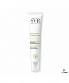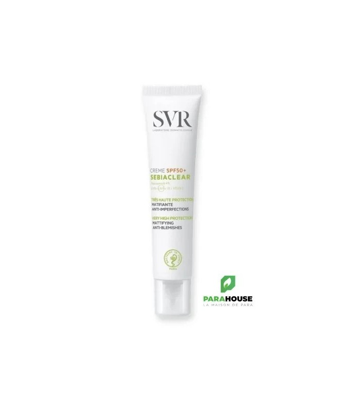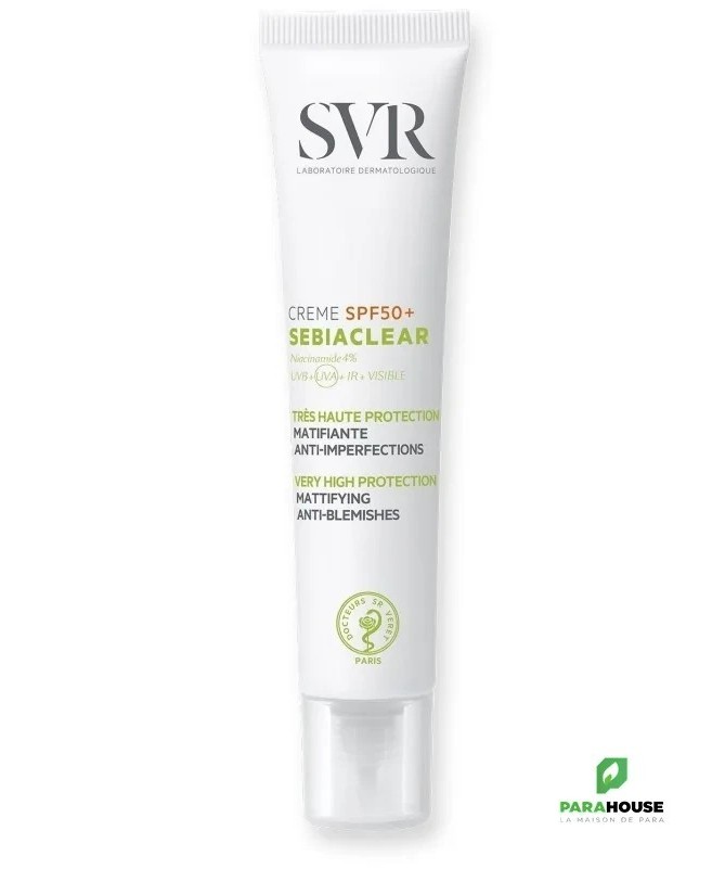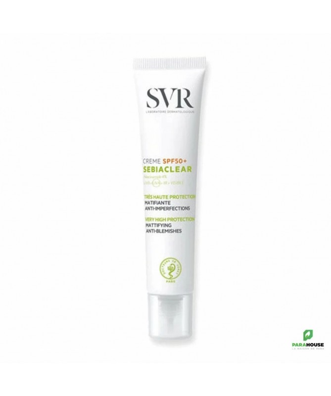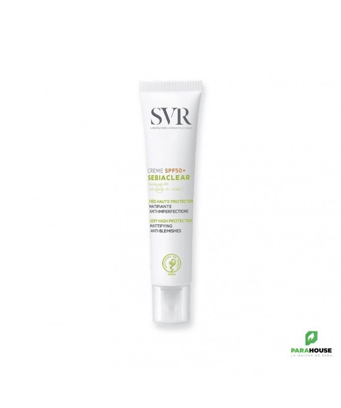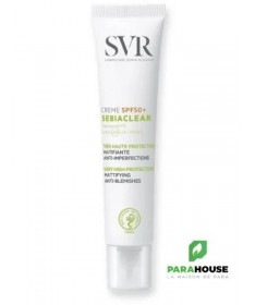 SVR SEBIACLEAR CREME SPF50+ Nouveau SVR Sebiaclear Creme SPF50+ protège et corrige les peaux grasses à imperfections. Matifiante, elle prévient l’effet rebond lié à l’exposition UV pour éviter imperfections et marques. SVR Sebiaclear SPF50+ nouvelle formule, 2 en 1, protection solaire et soin : réduit imperfections et points noirs, matifie et prévient les marques brunes ou rouges et l’effet rebond liés aux UV. Sa nouvelle texture hydratante 8h pénètre très facilement et elle matifie votre peau pour une utilisation idéale en soin de jour. svr creme spf50+ sebiaclear possède une texture fluide et légère Fini invisible aveb pénétration rapide. SON + : La crème SEBIACLEAR SPF50 a été reformulée pour respecter toujours mieux la peau et la planète : Brevet(1) Solaire SVR : 4 années de recherche pour inventer l’association filtrante idéale qui délivre à la fois une très haute protection solaire dermatologique UVB + UVA + VISIBLE + INFRAROUGES tout en respectant l’environnement marin. Sans compromis sur l’efficacité et la sensorialité ! Niacinamide (4%) + Acide salicylique : Régulent le sébum, limitent la prolifération bactérienne, diminuent les imperfections et lissent le grain de peau. Son nouveau tube au format canule pour une application facile est éco-responsable. Il est composé à 50% de plastique recyclé et 100% recyclable. Composition: AQUA/WATER/EAU, SILICA, DIETHYLAMINO HYDROXYBENZOYL HEXYL BENZOATE, DIISOPROPYL ADIPATE, ETHYLHEXYL TRIAZONE, BEHENETH-25, ISONONYL ISONONANOATE, NIACINAMIDE, BIS-ETHYLHEXYLOXYPHENOL METHOXYPHENYL TRIAZINE, GLYCERIN, C12-15 ALKYL BENZOATE, C15-19 ALKANE, DIETHYLHEXYL BUTAMIDO TRIAZONE, GLYCERYL STEARATE CITRATE, ACRYLATES/C12-22 ALKYL METHACRYLATE COPOLYMER, PENTYLENE GLYCOL, BUTYLENE GLYCOL, SALICYLIC ACID, 1,2-HEXANEDIOL, CAPRYLYL GLYCOL, PARFUM (FRAGRANCE), ARGININE, COCO-GLUCOSIDE, XANTHAN GUM, TOCOPHEROL, SODIUM HYDROXIDE, DISODIUM LAURYL SULFOSUCCINATE, GLYCINE SOJA (SOYBEAN) OIL, LECITHIN, SARCOSINE, LEPIDIUM SATIVUM SPROUT EXTRACT Conseils d'utilisation : Il est indiqué d'appliquer SEBIACLEAR CREME SPF50+ sur l'ensemble du visage avant toute exposition au soleil. Appliquer généreusement et uniformément avant l’exposition pour bien couvrir la surface exposée. Réduire cette quantité diminue nettement le niveau de protection. Un produit solaire ne protège jamais totalement. Renouveler fréquemment l’application pour maintenir la protection, surtout après avoir transpiré, avoir nagé ou s’être essuyé.