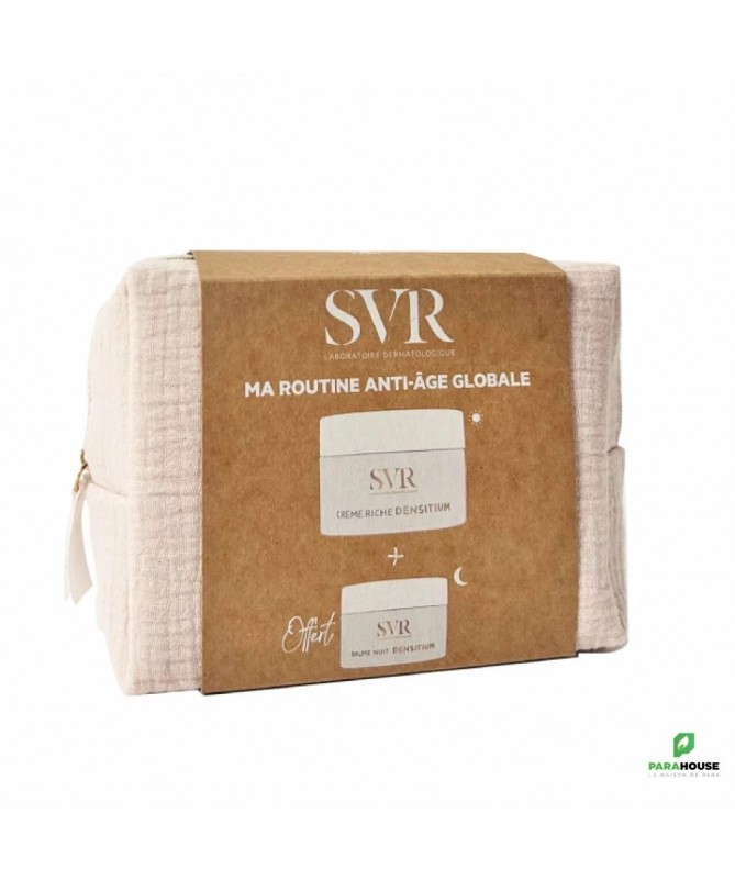 SVR DENSITIUM COFFRET Ma Routine Anti Age Globale - Peaux Sèches à Très Sèches SVR DENSITIUM COFFRET Ma Routine Anti Age Globale - Peaux Sèches à Très Sèches : SVR DENSITIUM CREME RICHE - SOIN DENSIFIANT COMPLET 50ML : SVR DENSITIUM CREME RICHE est destinée aux femmes de plus de 45 ans, l'âge où l'épiderme et le métabolisme se ralentit. C'est à ce moment que la peau perd sa densité et devient sèche. Pour cela les laboratoires SVR ont travaillé pour créer cette crème dont la puissance du Bio-calcium réactive la cohésion cellulaire et ce en s'associant aux Kératinocytes, il ne faut pas oublier qu'il permet aussi de restructurer l'épiderme DENSITIUM Baume de Nuit 15ML OFFERT : Innovation DENSITIUM, la correction globale dermatologique pour une efficacité renforcée sur l’ensemble des signes de l’âge : sécheresse, rides, relâchement cutané, perte d’éclat et d’uniformité. DENSITIUM BAUME NUIT a été spécialement formulé pour accompagner la peau dans les bouleversements dus à la ménopause et répondre aux besoins des peaux matures. Il contrebalance les effets liés au dérèglement de la chronobiologie cutanée.