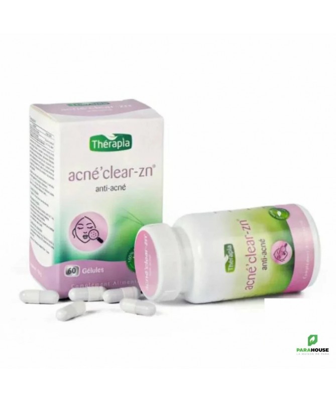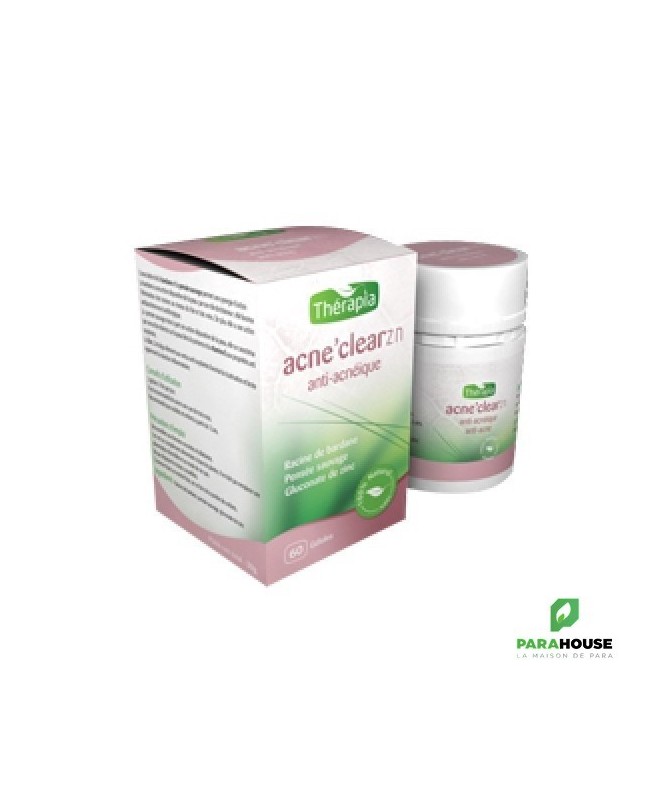 THERAPIA ACNE'CLEAR-ZN 60 GELULES THERAPIA ACNE'CLEAR-ZN est un traitement pour les affections cutanées liées à une insuffisance d’élimination (acné..) PROPRIETES ET MODE D’ACTION: ACNE CLEAR ZN présente des actions antibactériennes et antifongiques grâce à la présence de polyénes. Il présente également une action diurétique et cholérique grâce à la présence d’acide-alcools qui drainent les toxines et favorisent leur élimination au niveau des reins et du foie. THERAPIA ACNE'CLEAR-ZN freine la sécrétion sébacée. Il présente une action dépurative Therapia Acne'Clear-ZN présente une action antioxydante qui est liée à la présence de vitamine E Gluconate de Zinc Ces gélules favorisent la cicatrisation et limitent la réaction anti-inflammatoire COMPOSITION: Racine de bardane, pensée sauvage, gluconate de Zinc (30 mg /jour) Conseils d'utilisation : 2 gélules 2 fois par jour en cure de trois mois. Déconseillées aux femmes enceintes et allaitantes. Ceci est un complément alimentaire à base de plantes. il ne doit pas remplacer une alimentation diversifiée et un mode de vie sain.