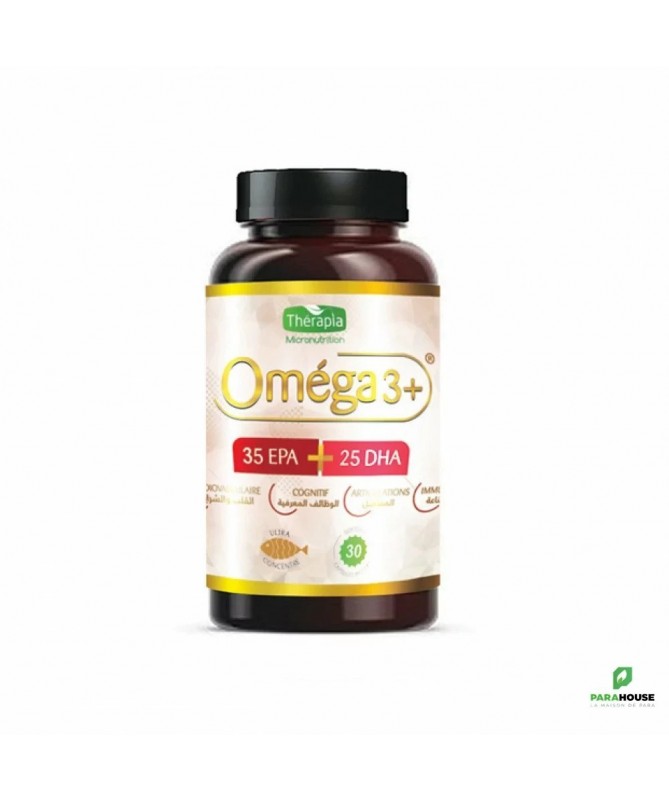 THERAPIA OMEGA 3+ - 30 GELULES THERAPIA OMEGA 3 est un complèment alimentaire très benifique pour la sante du corps puisque les omega 3contribuent activement à nombre de fonctions de l'organisme humain. OMEGA 3 : Protège des maladies cardiovasculaires et régule la tension artérielle. Contribue au bon développement du cerveau et la rétine chez l’enfant. Contribue à réduire les douleurs articulaires. Favorise la concentration et la mémoire et améliore les fonctions cognitives. Combat le mauvais cholestérol et réduit les taux de lipides sanguins. Protège et hydrate la peau. PROPRIÉTÉS : Protection cardiovasculaire et réduction des douleurs articulaires: EPA, DHA peuvent être transformés dans le corps en divers composés, prostaglandines, leucotriènes, eicosa-noîdes, qui ont des propriétés anti-inflammatoires. Les fonctions cognitives et développement du cerveau : Présents dans la membrane des cellules nerveuses (les vésicules synaptique) ce qui facilite la transmission du message. Hydratation de la peau : Fluidifie les tissus et assouplie l’épiderme. Cholestérol et lipides sanguin : Diminue le taux de VLDL, régule le rapport cholestérol total / HDL, réduit le taux des triglycérides dans le sang Composition : Huile de poisson 35/25, EPA, DHA, Vitamine E alpha-tocopherol Conseils d'utilisation : 2 gélules de THERAPIA OMEGA 3 par jour au milieu du repas. Une cure de 1 à 3 mois de OMEGA 3 est conseillée, à renouveler dans l’année si besoins Ne pas dépasser la dose journalière recommandée. Personne allergiques au poisson. Avis médical pour les personnes ayant un traitement d’anticoagulant. Un complément alimentaire ne remplace en aucun cas une alimentation variée et équilibrée ainsi qu’un style de vie sain A conserver à l’abri de la chaleur, la lumière et l'humidité