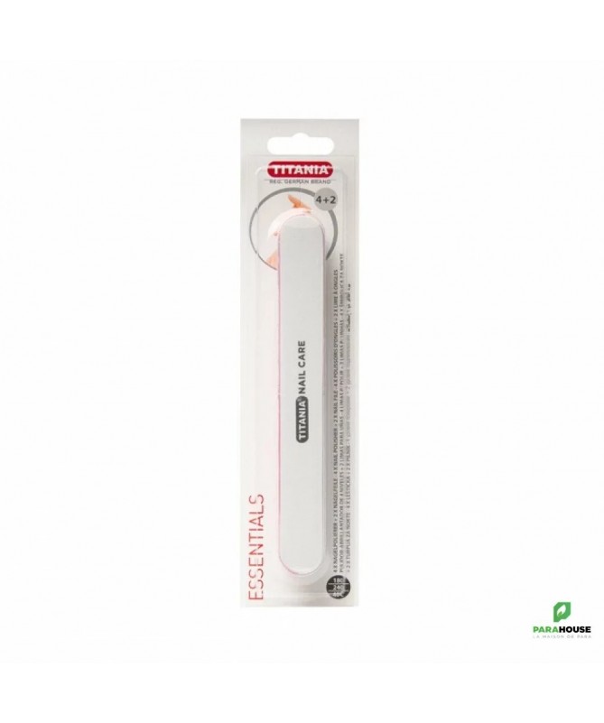 TITANIA POLISSOIR 6 Surfaces - 1038/B TITANIA POLISSOIR 6 Surfaces 1038/B enlève les entailles des ongles, restaure la texture lisse et élimine le vernis à ongles indésirable. Polisseuse à ongles avec 6 surfaces, sur blister Polisseuse à ongles à 4 niveaux (état, niveau avant polissage, brillance brillante)Lime à ongles 2 faces (limes, manucure fine) Avec ponçage de haute qualité