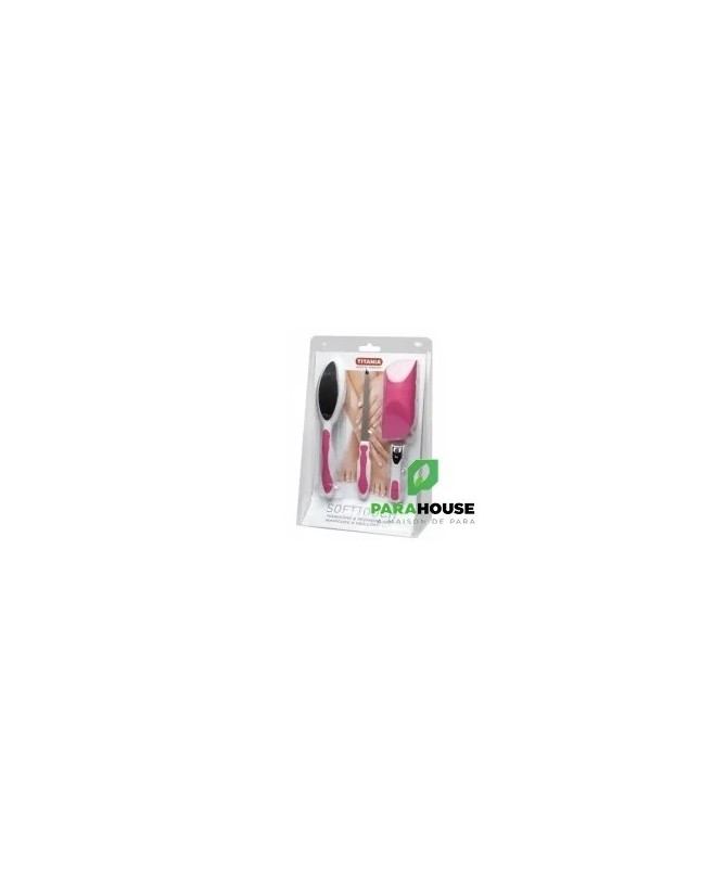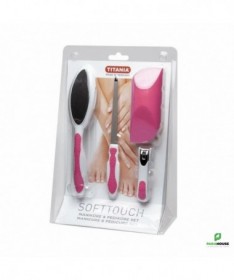 TITANIA SOFTTOUCH Set Pedicure - 3025/5K B TITANIA SOFTTOUCH Set Pedicure est l'ensemble de pédicure parfait de la marque TITANIA , dans lequel vous trouverez tout ce dont vous avez besoin pour ajuster vos pieds. L'ensemble Softouch de haute qualité contient : coupe-ongles pointu pour un raccourcissement confortable des ongles, une lime en cuir durci double face qui lisse magnifiquement vos talons, une pierreponce fine une lime à ongles en saphir adaptée au traitement des ongles et sur les mains.