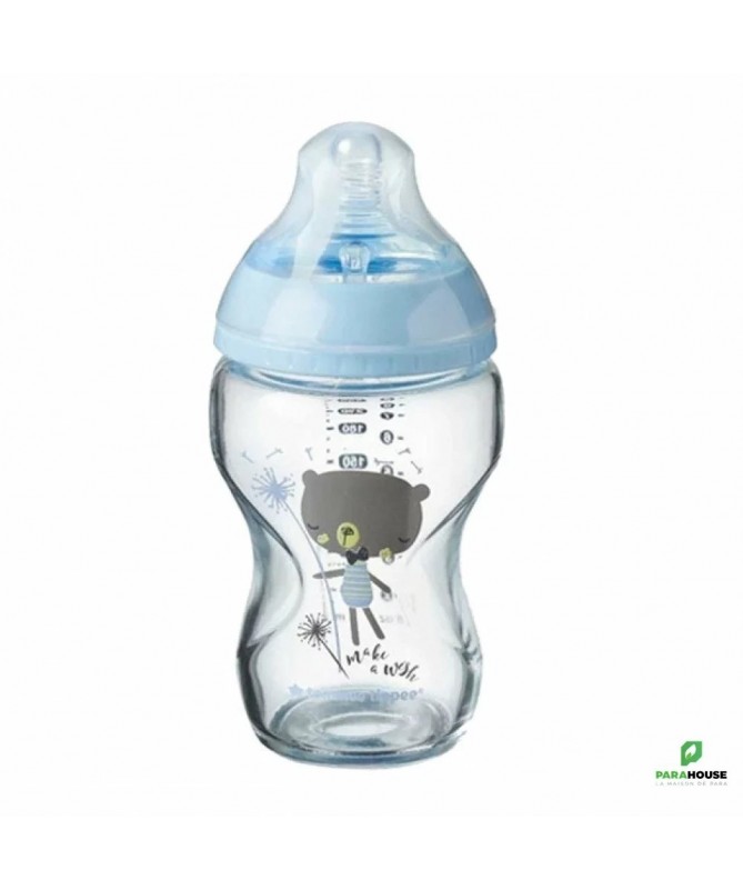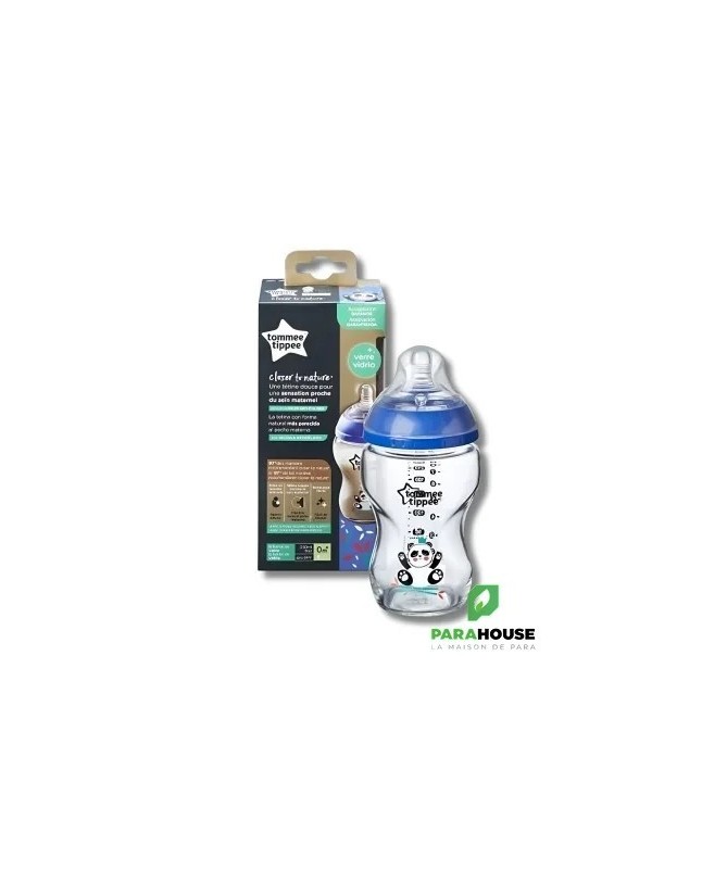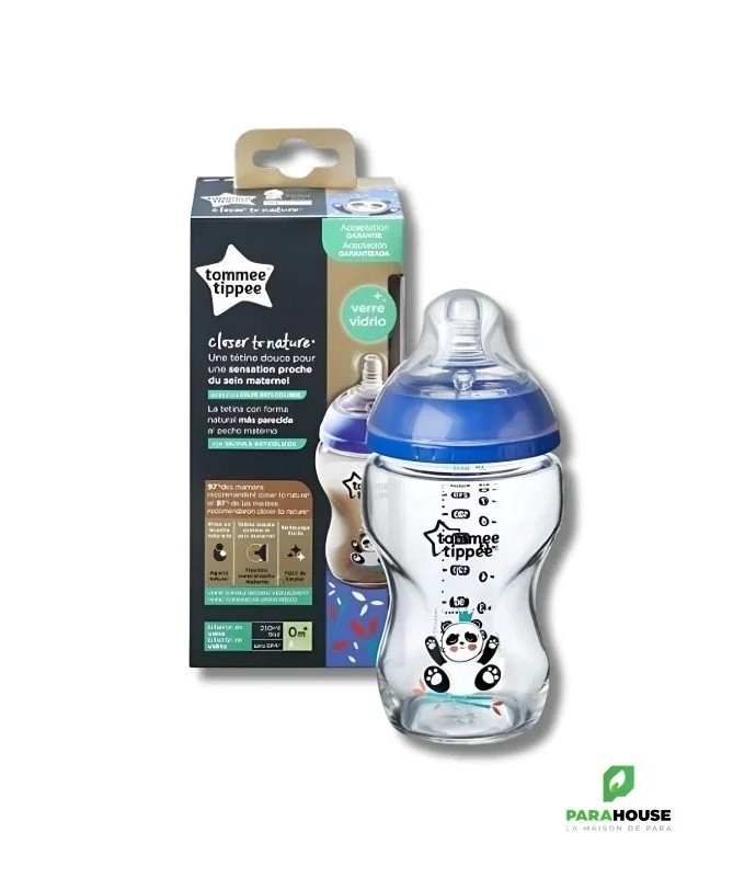 TOMMEE TIPPEE CLOSER TO NATURE BIBERON VERRE 250ML - Ours Bleu TOMMEE TIPPEE CLOSER TO NATURE BIBERON avec une tetine en silicone doux et flexible comme la peau qui reproduit les mouvements naturels de la tétée lors de l'allaitement et une valve Easi-vent brevetée qui empêche l'accumulation de résidu de lait et permet la meilleure ventilation. Biberon en verre résistant aux tâches Biberon le plus recommandé : 95 % des mamans recommanderaient les biberons Closer to Nature à d'autres Col de biberon large : encourage l'action d'alimentation intuitive de votre bébé tandis que la forme compacte du biberon permet à bébé d'être plus près de vous Nettoyage facile : le biberon à col large facilite le nettoyage et les biberons peuvent être utilisés au lave-vaisselle, au micro-ondes et dans les stérilisateurs à vapeur. Dévissez simplement votre biberon en trois parties pour un nettoyage et une stérilisation faciles Les biberons Closer to Nature sont compatibles avec toutes les tétines Closer to Nature, à l'exception des tétines Advanced Anti-Colic 100% sans BPA pour une tranquillité d'esprit totale.