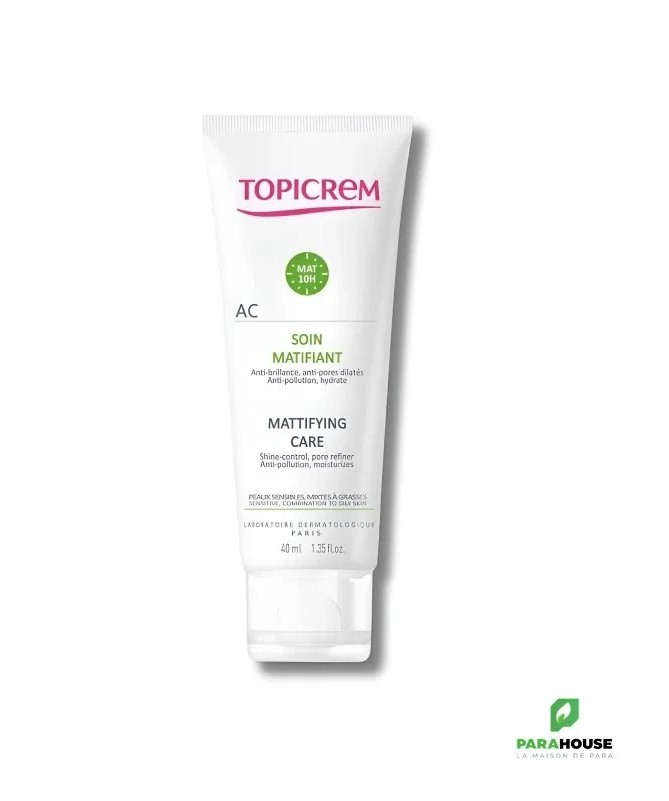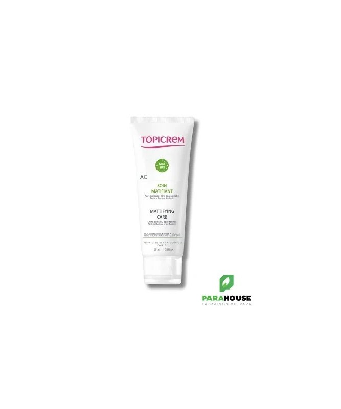 Soin matifiant AC Topicrem: conçu pour les peaux sensibles mixtes à grasses, il hydrate tout en garantissant un teint matifié jusqu'à 10h. Composé de poudres micro-absorbantes et de gluconate de zinc, il régule l'excès de sébum, resserre les pores et aide à garder la peau nette et sans imperfections. Sa formule légère et non grasse protège la peau des agressions extérieures tout en assurant une hydratation optimale. Testé dermatologiquement, il est sans paraben, alcool, silicone, ni huile minérale.