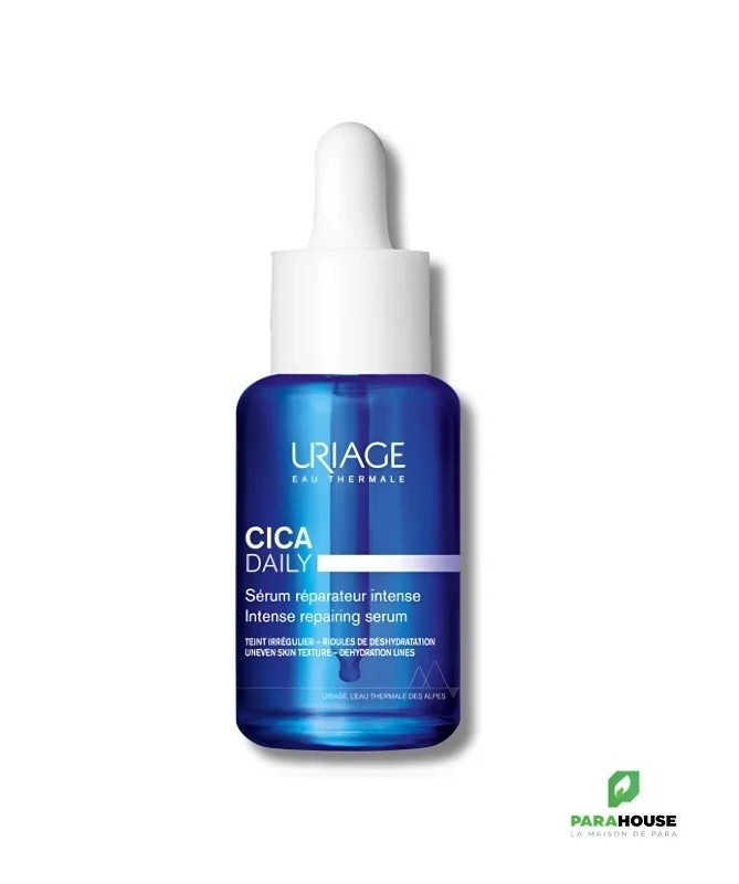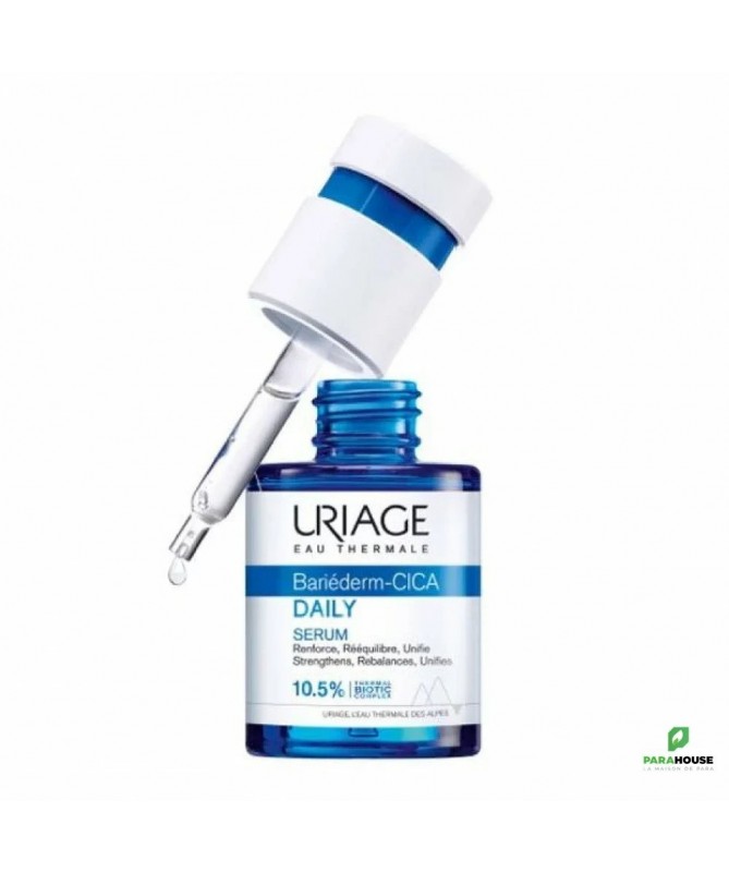 URIAGE CICA DAILY SERUM 30ML - Inconfort, imperfections, rougeurs, marques URIAGE CICA DAILY SERUM est un sérum dermatologique haute tolérance renforce, qui protège et répare la barrière de la peau selon le principe de l'auto-réparation cellulaire active. Les peaux matures ou fatiguées y trouvent la nouvelle force de leur jeunesse. Cette formule spécifique haute tolérance aide à protéger et réparer les zones les plus fragiles du visage, tout en prévenant les rougeurs et atténue les petites imperfections. Enrichie en Eau Thermale d'Uriage à 10,5% associée à un prébiotique, l'Inuline, Bariéderm CICA Daily Serum permet à la peau de retrouver éclat, souplesse et fermeté. L’association d’Acide Hyaluronique Haut et Bas poids moléculaire et de la Vitamine B5 associée à la Centella Asiatica réparatrice rend ce sérume hydratant intensément la peau, favorise sa réparation épidermique et homogénéise le teint. Formulé avec du dipeptide pour renforcer ta peau contre le processus de vieillissement et aider à prévenir l'apparition des signes de l'âge. RENFORCE LA BARRIÈRE CUTANÉE, PUISSANT ANTIOXYDANT : [10,5% THERMAL-BIOTIC] L’Eau Thermale d’Uriage associée à l’Inuline, un prébiotique, renforce les barrières physique et immune de la peau et rééquilibre la barrière du microbiome. RÉPARE, RÉGÉNÈRE ET UNIFIE : La synergie de la Centella Asiatica réparatrice, de l’Acide Hyaluronique, hydratant et repulpant, et de la Vitamine B5, apaisante et unifiante, stimule les mécanismes de réparation de la peau et renforce ses défenses, la rendant plus résistante aux agressions du quotidien. Le teint est lissé et unifié grâce à l'action du Dipeptide, prévenant ainsi l'apparition des signes de l'âge. Non parfumé Haute tolérance Texture fraîche ultra-fluide Testé sous contrôle dermatologique Résultats 85% : Grain De Peau Affiné Et Teint Unifié 90% : Peau Lissée Composition : AQUA (WATER, EAU) — GLYCERIN — DIGLYCERIN — 1,2-HEXANEDIOL — INULIN — PANTHENOL — SODIUM POLYACRYLOYLDIMETHYL TAURATE — XANTHAN GUM — SODIUM HYALURONATE — PROPANEDIOL — CENTELLA ASIATICA LEAF EXTRACT — CITRIC ACID — ZINC GLUCONATE — GLUTAMYLAMIDOETHYL INDOLE Conseils d'utilisation : Il est conseillé d'appliquer 1 à 2 pipettes de uriage daily serum matin et soir sur l’ensemble du visage, avant votre Bariéderm CICA DAILY GEL CRÈME sur une peau parfaitement nettoyée et séchée. Éviter le contact avec les yeux.