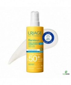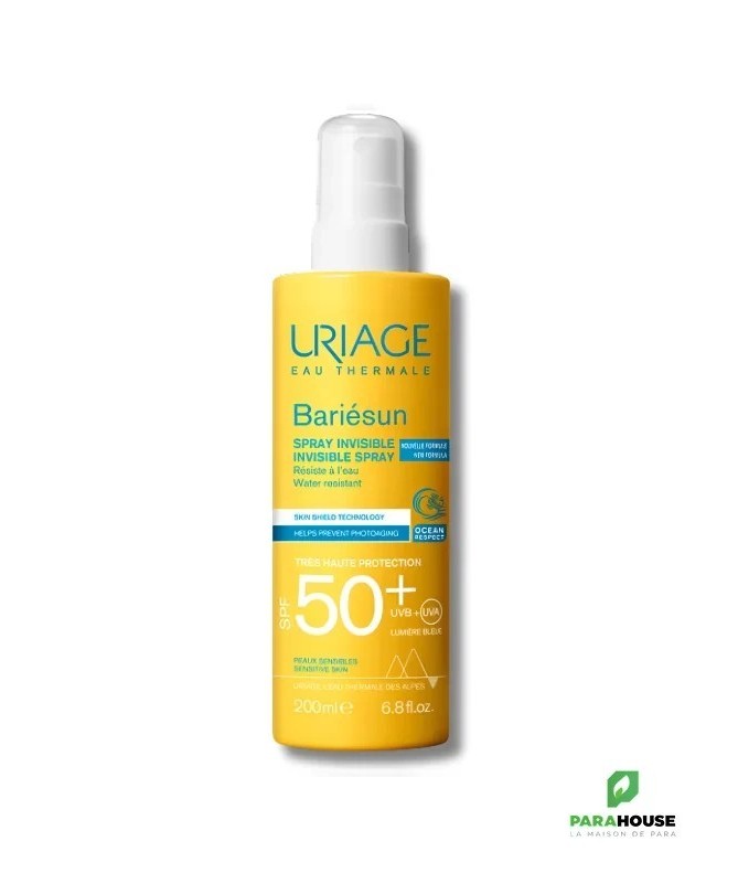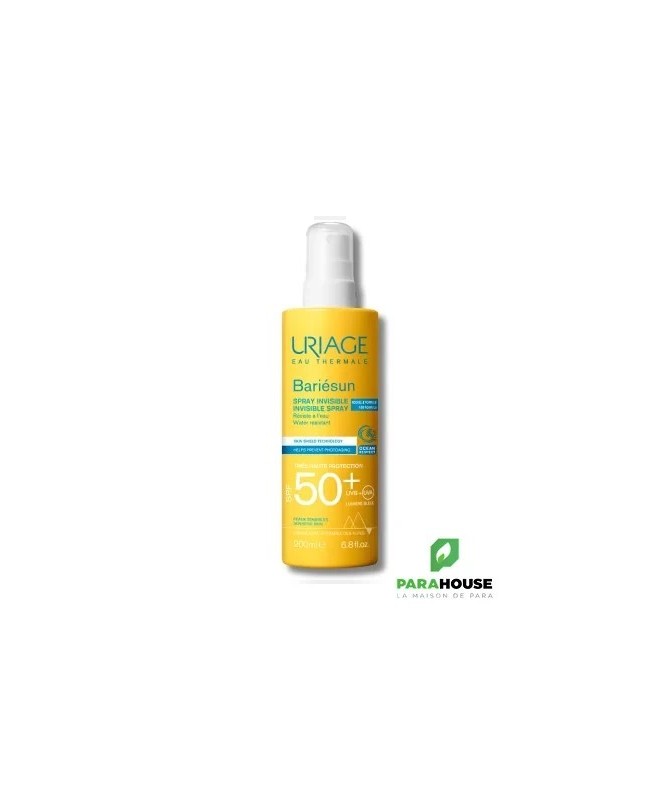 URIAGE BARIÉSUN - SPRAY SPF50+ 200ML - SOIN SOLAIRE BOUCLIER - ULTRA-PROTECTION URIAGE BARIESUN SPRAY INVISIBLE combine un complexe filtrant très performant et un brevet pour protéger la peau, prévenir les dommages cellulaires et le photo-vieillissement induits par les UVA, UVB et la lumière bleue. BARIESUN SPRAY INVISIBLE de très haute protection à la texture légère et agréablement parfumée garantit un fini invisible et un plaisir d’utilisation renouvelé à chaque application. Un spray solaire haute tolérance, testé sous contôle dermatologique. ULTRA-PROTECTION SPF50+ : Son complexe de filtres assure une très haute protection contre les UVA, UVB, lumière bleue et les radicaux libres. Prévention des dommages cellulaires et du photo-vieillissement : La technologie Skin Shield développée par nos laboratoires combine l’Eau Thermale d’Uriage, actif unique qui aide à protéger l’ADN et le brevet [TELOMERES PROTECT] qui aide à prévenir les dommages cellulaires et le photo-vieillissement dus aux UV et à la lumière bleue. Puissante action antioxydante & Prévention du dessèchement cutané : Le spray invisible SPF50+ préserve les cellules de la peau de l'oxydation grâce à la combinaison d'un dérivé d'algue naturelle, l'astaxanthine, et de la vitamine E. Enrichi en Aquaspongines, il assure une protection intense contre le dessèchement. Composition : AQUA (WATER, EAU) — DICAPRYLYL CARBONATE — DIETHYLAMINO HYDROXYBENZOYL HEXYL BENZOATE — C12-15 ALKYL BENZOATE — ETHYLHEXYL TRIAZONE — PHENYLBENZIMIDAZOLE SULFONIC ACID — BIS-ETHYLHEXYLOXYPHENOL METHOXYPHENYL TRIAZINE — DIETHYLHEXYL BUTAMIDO TRIAZONE — HEPTYL UNDECYLENATE — PROPANEDIOL — TRIACONTANYL PVP — C20-22 ALKYL PHOSPHATE — C20-22 ALCOHOLS — SODIUM HYDROXIDE — DECYL GLUCOSIDE — BUTYLENE GLYCOL — GLUCOSE — PARFUM (FRAGRANCE) — COCO-GLUCOSIDE — CHLORPHENESIN Conseils d'utilisation : Il est recommandé d'appliquer une dose généreuse et homogène d' URIAGE BARIESUN SPRAY INVISIBLE pour bien couvrir la zone exposée au soleil. Renouveler l’application fréquemment, surtout après avoir transpiré, nagé ou s’être essuyé. Même bien protégé, réduire au maximum l’exposition.