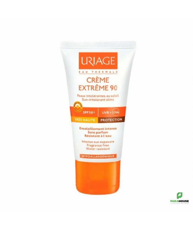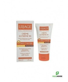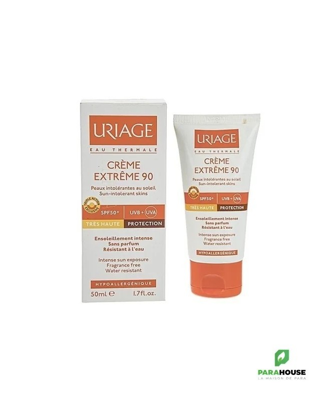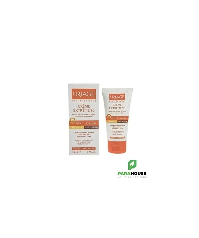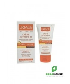 URIAGE Crème Extrême 90 SPF50+ 50ML URIAGE Crème Extrême 90 conçue pour les peaux intolérantes et les peaux les plus fragiles. Cette crème non grasse pénètre rapidement et garantit un maximum de sécurité et de tolérance. Résistante à l'eau, la peau est protégée du soleil cette créme permet d'h ydrater intensément et d'assurer une très haute protection spf 50+. Grâce à un complexe photoprotecteur 100% minéral, la peau sensible est protégée contre les UVA-UVB. Les actifs d'Aquaspongines et l'Eau Thermale d'Uriage assurent une protection intense contre le dessèchement. Composition : URIAGE Crème Extrême 90 est principalment composé de: Eau Thermale d’Uriage, Complexe 100 % minéral anti UVA-UVB , Aquaspongines , Vitamine C stabilisée et E Hypoallergénique ,Non comédogène ,Sans parfum, Sans alcool Conseils d'utilisation : Il est indiqué de bien agiter avant emploi. Avant l’exposition, pulvérisez généreusement (ex : 8 pulvérisations pour le mollet). La réduction de cette quantité diminue le niveau de protection. Il est préferable de Renouveler l’application de URIAGE Crème Extrême 90 fréquemment, surtout après avoir transpiré, nagé ou s’être essuyé. Ne pas vaporiser directement sur le visage ; vaporiser d’abord dans le creux de la main, puis appliquer sur le visage. Même bien protégé, réduire au maximum l’exposition. Ne pas exposer les bébés et les jeunes enfants directement au soleil. Utiliser dans un endroit bien ventilé. Ne pas inhaler intentionnellement.