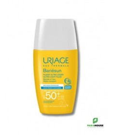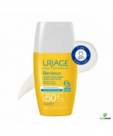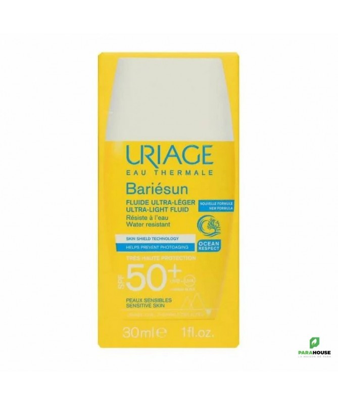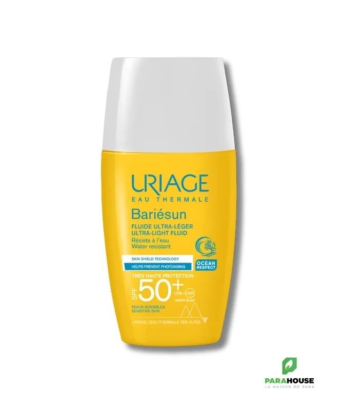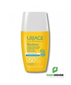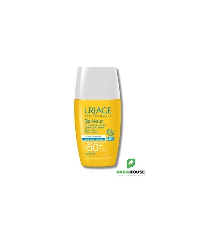 URIAGE BARIÉSUN - FLUIDE ULTRA-LÉGER SPF50+ 30ML - très Haute protection, texture ultra légère, fini invisible Uriage bariesun fluide Ultra Léger de TRÈS HAUTE PROTECTION spf 50+ conçu pour les peaux sensibles, ce fluide léger sans parfum apporte une très haute protection contre les UVA, les UVB et les radicaux libres. Sa texture ultra-fluide résistante à l’eau assure une pénétration rapide et un fini sec, sans effet blanc. Son format de poche de URIAGE BARIÉSUN FLUIDE SPF 50 le rend très pratique à utiliser en toute occasion ! Prévient contre le photo-vieillissement: L’Eau Thermale d’Uriage permet de lutter contre les méfaits du soleil. La barrière cutanée est alors renforcée et l’ADN est protégé de sa dégradation par les UV*. Protège contre les UV: Son complexe de filtres de dernière génération apporte une très haute protection contre les UVA, les UVB et les radicaux libres. Ce soin garantit une large couverture UVB-UVA et une très haute tolérance. Prévient le dessèchement cutané : Enrichi en Aquaspongines et en vitamine E, le fluide assure une protection intense contre le dessèchement et possède une action antioxydante Composition: AQUA (WATER, EAU) — DICAPRYLYL CARBONATE — C12-15 ALKYL BENZOATE — DIETHYLAMINO HYDROXYBENZOYL HEXYL BENZOATE — ETHYLHEXYL TRIAZONE — HEPTYL UNDECYLENATE — DIMETHICONE — SILICA — BIS-ETHYLHEXYLOXYPHENOL METHOXYPHENYL TRIAZINE — POLYGLYCERYL-6 POLYHYDROXYSTEARATE — GLYCERIN — MAGNESIUM STEARATE — POLYGLYCERYL-6 POLYRICINOLEATE — HYDROXYACETOPHENONE — GLUCOSE — BENZOIC ACID — GLYCERYL BEHENATE — TOCOPHERYLACETATE — TREHALOSE — SODIUM HYDROXIDE — TOCOPHEROL — SPIRULINA PLATENSIS EXTRACT — HAEMATOCOCCUS PLUVIALIS EXTRACT — OLEA EUROPAEA (OLIVE) FRUIT OIL — ASCORBYL PALMITATE — GLYCINE MAX (SOYBEAN) OIL Conseils d'utilisation: Il est indiqué d'Agiter bariésun fluide Ultra Leger avant emploi. Avant l’exposition, appliquer une dose suffisante pour bien couvrir la zone exposée, par exemple l’équivalent d’une cuillère à café de produit pour le visage et le cou. La réduction de cette quantité diminue le niveau de protection. Renouveler l’application fréquemment, surtout après avoir transpiré, nagé ou s’être essuyé. Même bien protégé, réduire au maximum l’exposition. Ne pas exposer les bébés et les jeunes enfants directement au soleil.