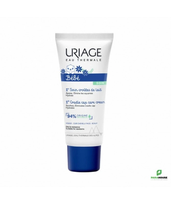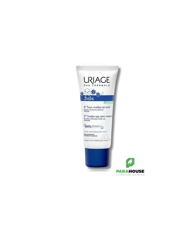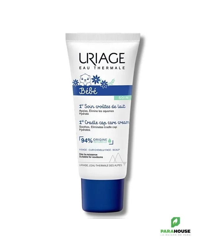 URIAGE BEBE 1er Soin Croutes de Lait 40ML - SOIN REGULATEUR, PURIFIANT ET APAISANT POUR LES CROUTES DE LAIT URIAGE BEBE 1er Soin Croutes de Lait est une crème qui permet de traiter la tête et le visage des nourrissons, de diminuer les squames,purifier et apaiser le cuir chevelu. Uriage soin croute de lait est un soin léger et facile à utiliser, qui ne laisse pas de film gras et qui empêche la prolifération de la flore cutanée sur le visage et le cuir chevelu. Sa texture hydratante, légère et non grasse redonne souplesse et douceur au cuir chevelu délicat de bébé ! Soin croute de lait uriage : APAISE : Enrichie en Eau Thermale d’Uriage, ce soin apaise et calme les irritations du cuir chevelu. ELIMINE LES CROÛTES DE LAIT : Ce soin élimine les croûtes de lait tout en hydratant et permet de limiter la prolifération des micro-organismes pour préserver un cuir chevelu sain et apaisé. Composition : AQUA (WATER, EAU) — GLYCERIN — OCTYLDODECANOL — BUTYLENE GLYCOL — BUTYROSPERMUM PARKII (SHEA) BUTTER — SODIUM POLYACRYLATE — PENTYLENE GLYCOL — POLYSORBATE 60 — PIROCTONE OLAMINE — XANTHAN GUM — 1,2-HEXANEDIOL — CAPRYLYL GLYCOL — DIMETHICONE — PHYTOSPHINGOSINE — CITRIC ACID — ASIATICOSIDE Pas de parfum Testé sous contrôle dermatologique et pédiatrique Texture riche non collante Haute tolérance Conseils d'utilisation : Il est conseillé d'appliquer URIAGE BEBE 1er Soin Croutes de Lait sur les croûtes de lait en massant légèrement et laisser agir toute la nuit. Il est recommandé de laver le cuir chevelu le lendemain en utilisant le 1er Shampooing de la gamme URIAGE BEBE.