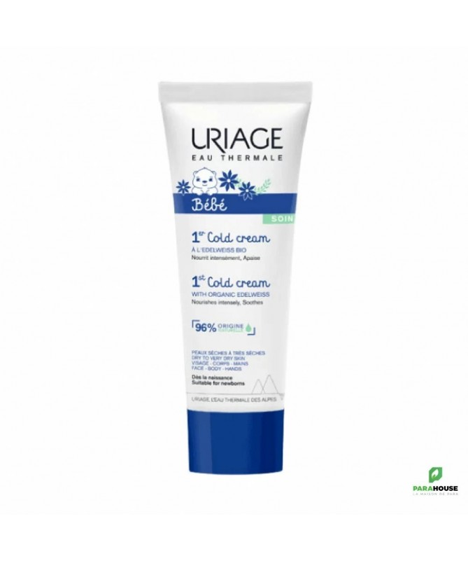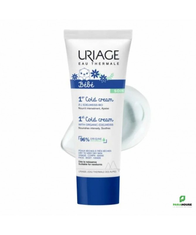 URIAGE BEBE 1er COLD CREAM CRÈME ULTRA-NOURRISSANTE 75ML Uriage Cold Cream bebe ourrit intensément et protège la peau sèche et délicate de bébé contre les agressions extérieures (vent, froid, eau calcaire…). Sa formule au complexe naturel [Eau Thermale d'Uriage + Edelweiss bio] apaise et apporte un confort immédiat. Cette crème à base d'actifs surgraissants dont le Squalane Végétal riche en acides gras essentiels, restaure le film hydrolipidique de la peau. URIAGE BEBE 1er COLD CREAM NOURRIT INTENSEMENT : Enrichi en cire d'abeille et en huile de tournesol, ce soin est ultra-nourrissant et adoucissant. Le Squalane végétal aide à restaurer le film hydrolipidique. APAISE & PROTEGE : La formule au complexe [Eau thermale d’Uriage + Edelweiss bio], associée à l’huile de jojoba protège et apaise la peau délicate de bébé. Résultat : 96% d'efficacité pour les enfants ayant testés le Cold cream. Etude réalisée sous contrôle pédiatrique sur 22 enfants. Evaluation par le pédiatre. Conseils d'utilisation: Il est recommandé d'appliquer URIAGE BEBE 1er COLD CREAM sur le visage et le corps sur une peau parfaitement nettoyée et séchée. Composition : Testé sous contrôle pédiatrique Texture riche non collante Haute tolérance AQUA (WATER, EAU) — CAPRYLIC/CAPRIC TRIGLYCERIDE — SQUALANE — SODIUM CHLORIDE — POLYGLYCERYL-2 DIPOLYHYDROXYSTEARATE — GLYCERIN — BUTYROSPERMUM PARKII (SHEA) BUTTER — SIMMONDSIA CHINENSIS SEED OIL — BUTYLENE GLYCOL — CERA ALBA (BEESWAX) — HELIANTHUS ANNUUS SEED OIL — POLYGLYCERYL-3 DIISOSTEARATE — STEARALKONIUM BENTONITE — MAGNESIUM SULFATE — HYDROXYACETOPHENONE — PROPANEDIOL — TOCOPHERYLACETATE — CITRIC ACID — LEONTOPODIUM ALPINUM FLOWER/LEAF EXTRACT