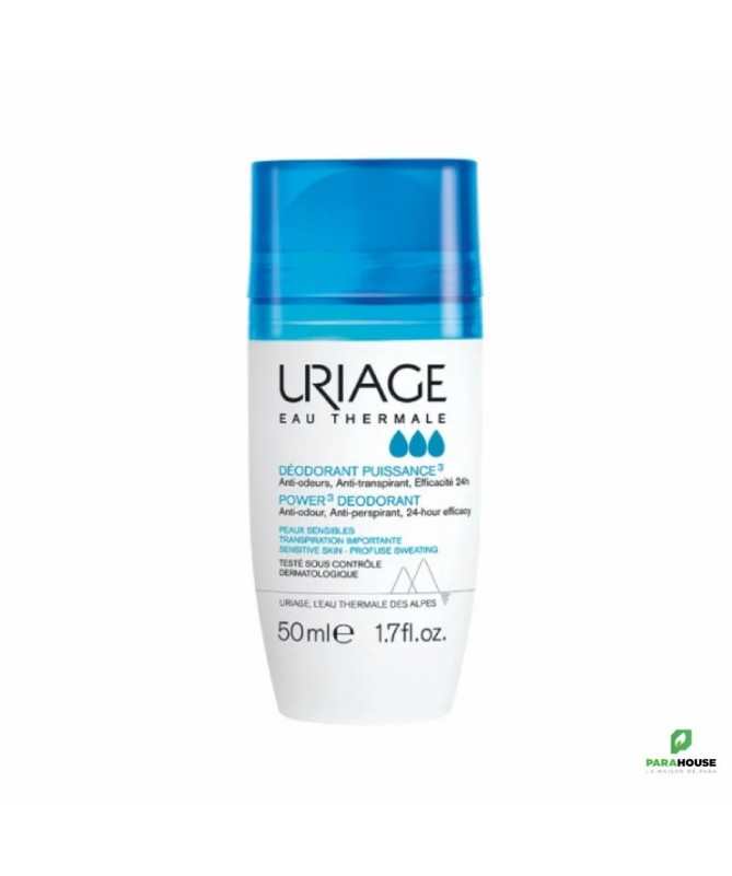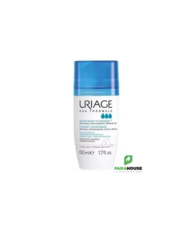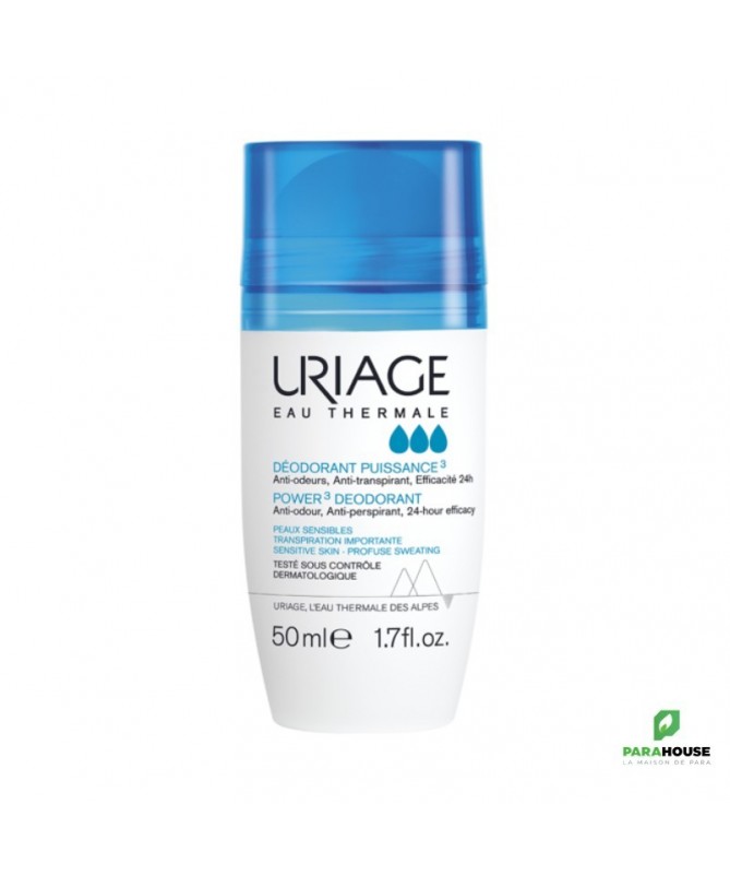 URIAGE DEODORANT PUISSANCE 3 50ML - Sans Alcool, Anti-odeur, ANTI-TRANSPIRANT Uriage deodorant puissance 3 agit efficacement sur la transpiration tout au long de la journée et lutte contre les odeurs. Il limite les traces blanches, jaunes et l’effet carton sur les vêtements. Le Déodorant uriage Puissance 3 apporte fraîcheur et netteté durant 24 heures. Agit sur la transpiration: Les sels d’aluminium limitent la transpiration. Evite la formation des odeurs: Le complexe d’actifs antibactériens et antienzymes lutte efficacement contre les odeurs. Apaise la peau sensible: Enrichi en Eau Thermale d'Uriage et en actifs apaisants, les aisselles sensibles sont adoucies. Résultats 100% anti-traces jaunes Composition : AQUA (WATER, EAU) ● ALUMINUM CHLOROHYDRATE ● BUTYLENE GLYCOL ● DIMETHICONE ● STEARETH-2 ● TRIETHYL CITRATE ● STEARETH-21 ● PROPANEDIOL ● PARFUM (FRAGRANCE) ● POLYACRYLATE CROSSPOLYMER-6 ● TETRASODIUM EDTA ● BISABOLOL ● ETHYLHEXYLGLYCERIN ● RHAMNOSE ● t-BUTYL ALCOHOL ● GLUCOSE ● GLUCURONIC ACID Conseils d'Utilisation : Facile d'utilisation, Il est recommandé d'appliquer le déodorant-bille URIAGE DEODORANT PUISSNACE 3 sur des aisselles propres et sèches. Ne pas appliquer sur peau endommagée.