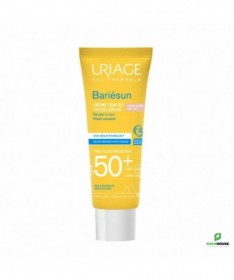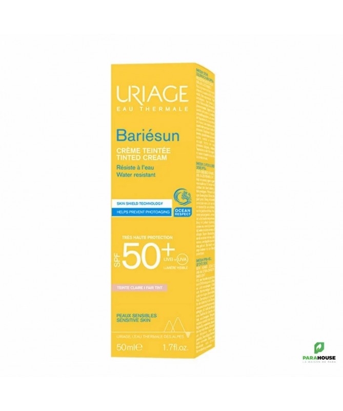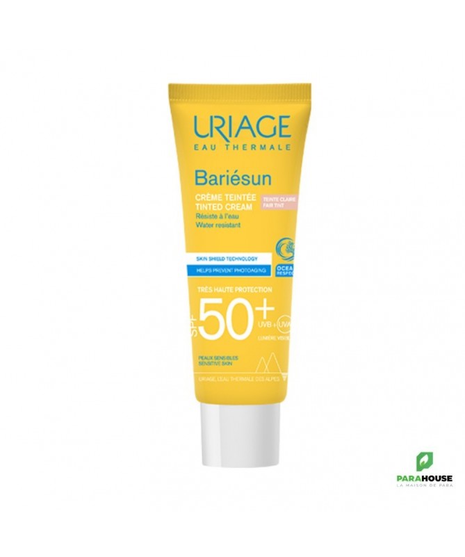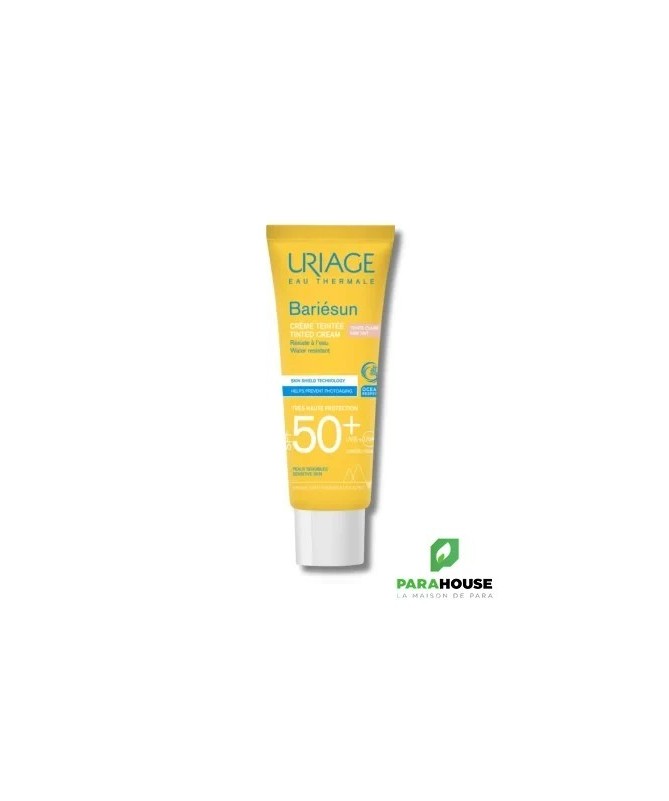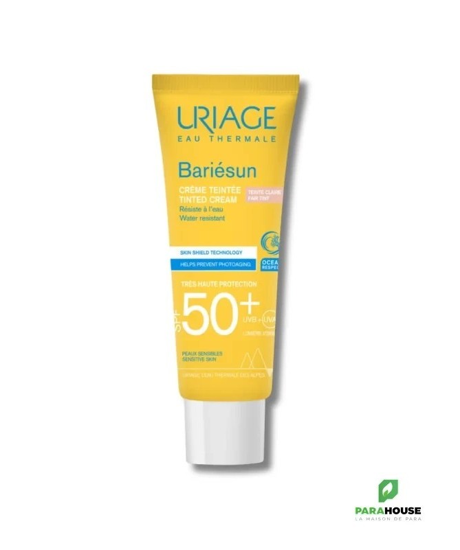 URIAGE BARIÉSUN Crème Teintée Claire SPF50+ 50ML - SOIN SOLAIRE BOUCLIER - ULTRA-PROTECTION URIAGE BARIESUN Creme Teintee SPF 50 conçue pour les peaux intolérantes et les peaux les plus fragiles, cette crème non grasse pénètre rapidement et garantit un maximum de sécurité et de tolérance. URIAGE Creme Teintee SPF 50 une bonne mine grâce à la teinte Claire, résistante à l'eau, la peau est protégée du soleil cette créme permet d'h ydrater intensément et d'assurer une très haute protection spf 50+. Sa formule très haute protection, fondante et non-grasse unifie naturellement le teint et apporte un effet bonne mine immédiat. Texture toucher sec nouvelle génération : absorption immédiate et effet anti-brillance assurés ! Prévient les dommages cellulaires et le photo-vieillissement : La technologie Skin Shield développée par nos laboratoires combine l’Eau Thermale d’Uriage, actif unique qui aide à protéger l’ADN et le brevet [TELOMERES PROTECT] qui prévient les dommages cellulaires et le photo-vieillissement dus aux UV et à la lumière bleue. Optimise la photoprotection : Le brevet [BARIESUN] forme un film protecteur sur la peau aidant à limiter la pénétration des filtres UV à la surface de l’épiderme et optimisant ainsi la photoprotection Embellit le teint : Ses pigments teintés unifient naturellement le teint, tout en apportant une couvrance optimale La crème assure une protection intense contre le dessèchement et possède une action antioxydante Composition : Complexe filtrant anti UVA-UVB-lumière bleue — [BREVET BARIESUN] – [BREVET TELOMERES PROTECT] — Eau Thermale d’Uriage — Vitamine E — Aquaspongines — Haute couvrance — Non comédogène — Testé sous contrôle dermatologique AQUA (WATER, EAU) — DICAPRYLYL CARBONATE — METHYLENE BIS-BENZOTRIAZOLYL TETRAMETHYLBUTYLPHENOL[NANO] — CI 77891 (TITANIUM DIOXIDE) — ETHYLHEXYL TRIAZONE — BUTYL METHOXYDIBENZOYLMETHANE — DIISOPROPYL SEBACATE — PROPYLENE GLYCOL DICAPRYLATE/DICAPRATE — C12-15 ALKYL BENZOATE — DIISOPROPYL ADIPATE — BIS-ETHYLHEXYLOXYPHENOL METHOXYPHENYL TRIAZINE — SILICA — TRIACONTANYL PVP — GLYCERIN — C20-22 ALKYL PHOSPHATE — C20-22 ALCOHOLS — DECYL GLUCOSIDE — HYDROGENATED PALM KERNEL GLYCERIDES — BUTYLENE GLYCOL — GLUCOSE — CI 77492 (IRON OXIDES) — XANTHAN GUM — PARFUM (FRAGRANCE) — COCO-GLUCOSIDE — BENZOIC ACID — TETRASODIUM EDTA — COCONUT ALCOHOL — HYDROGENATED PALM GLYCERIDES — CI 77491 (IRON OXIDES) — TRIETHOXYCAPRYLYLSILANE — HYDROGENATED POLYDECENE — TOCOPHERYLACETATE — o-CYMEN-5-OL — TREHALOSE — PROPYLENE GLYCOL — CI 77499 (IRON OXIDES) — CITRIC ACID — SODIUM HYDROXIDE — ASCORBYL TETRAISOPALMITATE — TOCOPHEROL — SPIRULINA PLATENSIS EXTRACT — POLYQUATERNIUM-51 Conseils d'utilisation : Il est indiqué de bien agiter URIAGE Creme Teintee avant emploi. Il est préferable de Renouveler l’application fréquemment, surtout après avoir transpiré, nagé ou s’être essuyé. Ne pas vaporiser directement sur le visage ; vaporiser d’abord dans le creux de la main, puis appliquer sur le visage. Même bien protégé, réduire au maximum l’exposition. Ne pas exposer les bébés et les jeunes enfants directement au soleil. Utiliser dans un endroit bien ventilé. Ne pas inhaler intentionnellement.