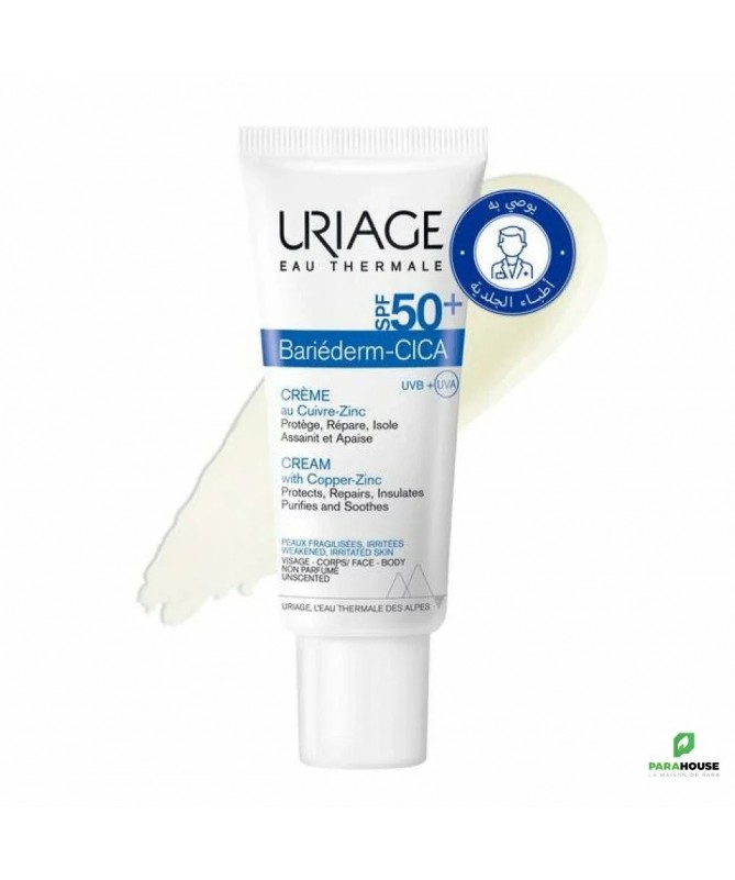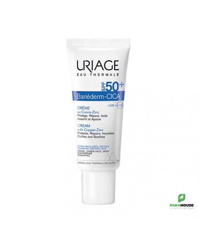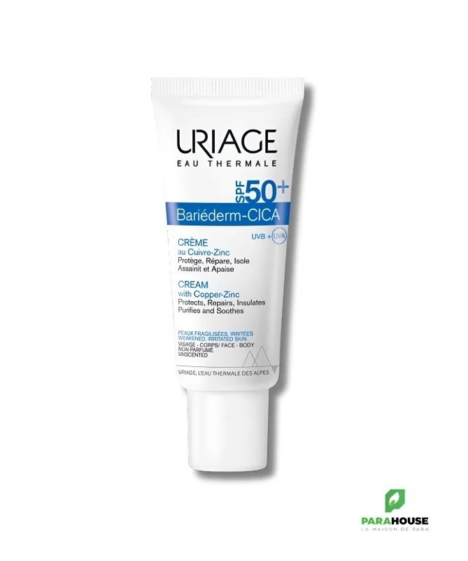 URIAGE BARIÉDERM - CICA CRÈME SPF50+ 40ML BARIEDERM CICA CREME SPF 50 (Soins peaux sensibles, Soins peaux irritées) URIAGE BARIEDERM CICA CREME SPF 50 est le soin idéal pour les peaux fragilisées à la suite d’agressions diverses pouvant être exposées au soleil : Sensations de démangeaisons, échauffements, post-actes dermo-esthétiques, tatouages... Uriage spf 50 bariederm : Isole et Protège : Double protection : Le brevet Poly-2P crée un « effet barrière » immédiat non-occlusif pour isoler et protéger la peau des agents extérieurs. La très haute protection solaire SPF50+ protège et aide à prévenir les marques post-cicatricielles (taches brunes ou rouges). Répare : Le complexe breveté GF-Repair stimule les facteurs de croissance pour favoriser la réparation de l’épiderme. Assainit et Apaise : L’Eau Thermale d’Uriage associé au D-Panthénol apaise immédiatement et durablement les irritations. Le Cuivre-Zinc aide à limiter le risque de prolifération bactérienne. Le Cuivre-Zinc aide à limiter le risque de prolifération bactérienne. Composition : Eau Thermale d’Uriage Cuivre-Zinc Poly-2P Smectite GF-Repair D-Panthenol Acide Hyaluronique Silicium Organique Filtres UVA/UVB Non parfumé Testé dermatologiquement AQUA (WATER, EAU) — ETHYLHEXYL METHOXYCINNAMATE — NEOPENTYL GLYCOL DIHEPTANOATE — CETYL PEG/PPG-10/1 DIMETHICONE — DICAPRYLYL ETHER — DIETHYLAMINO HYDROXYBENZOYL HEXYL BENZOATE — SODIUM CHLORIDE — ETHYLHEXYL TRIAZONE — DIMETHICONE — ETHYLHEXYL SALICYLATE — GLYCERYL BEHENATE — PANTHENOL — PEG-30 DIPOLYHYDROXYSTEARATE — BIS-ETHYLHEXYLOXYPHENOL METHOXYPHENYL TRIAZINE — DISTEARDIMONIUM HECTORITE — MAGNESIUM SULFATE — HYDROGENATED POLYDECENE — METHYLPROPANEDIOL — POLYGLYCERYL-3 DIISOSTEARATE — TOCOPHERYLACETATE — BUTYLENE GLYCOL — COPPER GLUCONATE — GLYCERIN — PROPYLENE CARBONATE — PROPANEDIOL — TRIACONTANYL PVP — XANTHAN GUM — CITRIC ACID — ZINC GLUCONATE — POLYQUATERNIUM-61 — HYALURONIC ACID — SILANETRIOL — BHT — BORAGE SEED OIL AMINOPROPANEDIOL AMIDES — GLUTAMYLAMIDOETHYL INDOLE — AMINOPROPANEDIOL — PENTAERYTHRITYL TETRA DI-T-BUTYL HYDROXYHYDROCINNAMATE Conseils d'Utilisation : Il est conseillé d'Appliquer Cica Creme spf 50 de Uriage 1 à 2 fois par jour sur une peau préalablement nettoyée avec le Bariéderm Cica-Gel Nettoyant. En cas d’exposition solaire, renouveler toutes les 2 heures et après chaque bain. Eviter le contour des yeux. Enfants – Adultes