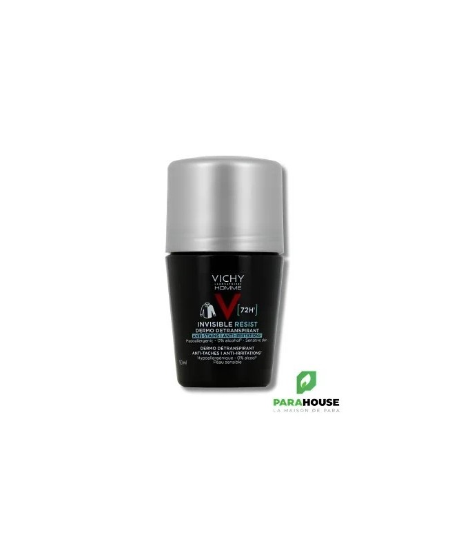 VICHY HOMME INVISIBLE RESIST 72HInvisible Resist 72hde Vichy est un dermo-détranspirant spécialement formulé pour les hommes. Il protège contre les taches et irritations tout en offrant une tolérance optimale.Sa formule efficace combine une actionanti-humiditéetanti-odeuravec une tolérance optimale grâce à sa formulesans alcool, hypoallergéniquetestée sur peau sensible. Elle prévient les irritations tout en protégeant vos vêtements.Doté de la technologieInvisi-Lockapprouvée par l’IFTH, il empêche l’apparition de traces jaunes sur les textiles clairs, blanches sur les textiles foncés, et limite les résidus qui rigidifient les tissus.Composition :AQUA / WATER / EAU • ALUMINUM CHLOROHYDRATE • DIMETHICONE • C14-22 ALCOHOLS • PARFUM / FRAGRANCE • STEARETH-100/PEG-136/HDI COPOLYMER • PERLITE • TETRASODIUM GLUTAMATE DIACETATE • C12-20 ALKYL GLUCOSIDE • PENTYLENE GLYCOL (F.I.L. N70040050/1)Conseil d'utilisation :Appliquer quotidiennement sur des aisselles propres et sèches.