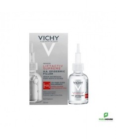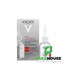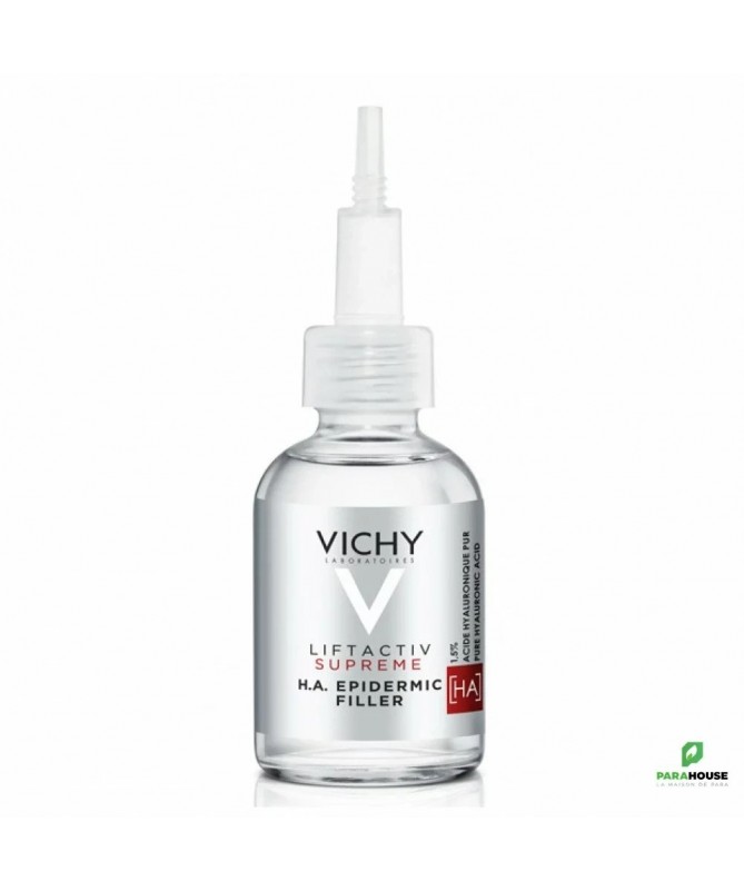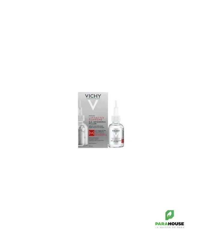 Description :Naturellement présent dans la peau, l’acide hyaluronique est une molécule qui contribue à sa fermeté. Mais sa concentration et sa production commencent à décliner à partir de la vingtaine, jusqu’à chuter brutalement à partir de 40 ans. Pour conserver une peau rebondi et lisse, il est indispensable de combler les pertes en acide hyaluronique quotidiennes avec un sérum à l’acide hyaluronique.H.A. Epidermic Filler LIFTACTIV SUPREME est un sérum anti-âge hautement concentré en acide hyaluronique qui cible les rides et la perte de fermeté sur le visage et le contour des yeux. Appliqué quotidiennement, ce sérum visage anti-âge délivre la juste dose d’acide hyaluronique pour des résultats visibles rapidement.Conçu pour tous les types de peaux, sa texture aqueuse pénètre instantanément dans la peau, vous permettant de poursuivre votre routine de soins anti-âge sans attendre.Jour après jour, les rides sont moins apparentes, la peau est repulpée et rebondie.Texture :Texture aqueuse et légère qui pénètre instantanément dans la peau.Application :Matin et soir sur peau propre et sèche, appliquez quelques gouttes du sérum à l’acide hyaluronique H.A. Epidermic Filler directement sur la patte d’oie et le sillon nasogénien, puis étalez le produit sur l’ensemble du visage.Complétez votre routine de soins anti-rides avec une crème de jour ou de nuit LIFTACTIV SUPREME, suivie d’une crème solaire visage uniquement le matin.Ingrédients :Ce sérum anti-âge est formulé avec des actifs dermatologiques reconnus pour limiter les effets du vieillissement cutané, notamment les rides et ridules.Acide hyaluronique (Sodium Hyaluronate)Molécule anti-âge de référence, l’acide hyaluronique agit sur plusieurs sphères de la peau. À haut poids moléculaire, il hydrate la peau en surface. À bas poids moléculaire, il pénètre dans la peau en profondeur pour lier les cellules et stimuler la production de collagène et d’élastine. La peau est ainsi hydratée, repulpée, à l’aspect rebondi.Vitamine Cg (Ascorbyl Glucoside)Appelée aussi Vitamine C glucoside, la vitamine Cg est un dérivé de la vitamine C. Antioxydante, elle neutralise les radicaux libres responsables du vieillissement cutané prématuré, estompe les taches pigmentaires et donne de l’éclat au teint.Eau volcanique de VichyRiche en minéraux et oligo-éléments, l’eau volcanique de Vichy revitalise, apaise et protège la peau, pour la rendre plus forte et plus éclatante.Composition :AQUA / WATER - GLYCERIN - HYDROXYETHYLPIPERAZINE ETHANE SULFONIC ACID - SODIUM HYALURONATE - PEG-60 HYDROGENATED CASTOR OIL - SECALE CEREALE SEED EXTRACT / RYE SEED EXTRACT - CALCIUM PANTOTHENATE - DIPEPTIDE DIAMINOBUTYROYL BENZYLAMIDE DIACETATE - PHENOXYETHANOL - CHLORPHENESIN - ASCORBYL GLUCOSIDE - DISODIUM EDTA - PENTYLENE GLYCOL