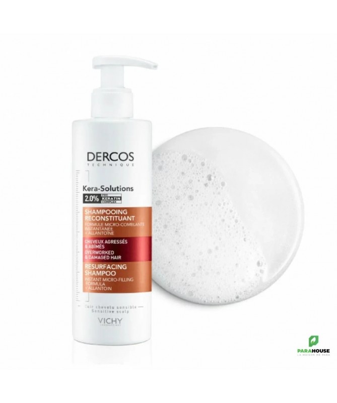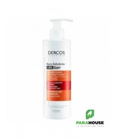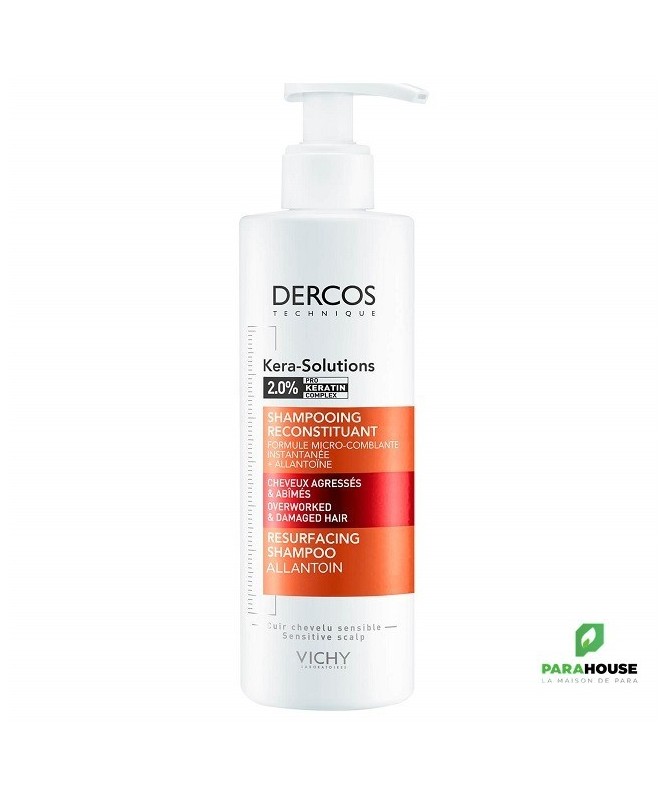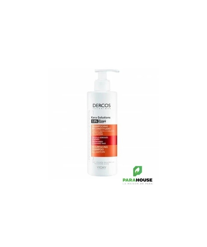 VICHY DERCOS KERA SOLUTIONS SHAMPOOING 250ML Le shampooing Dercos Kera Solutions de Vichy convient pour la réparation instantanée des cheveux abimés et agressés grâce à son complexe pro-kératine et à sa technologie micro-comblante. Vichy Dercos Kera Solutions Shampooing Reconstituant se compose : d'un complexe Pro-Kératine d'une technologie de micro-comblement d'ingrédients dermatologiques réparateurs d'Allantoïne apaisant et de Vitamine B5 fortifiante. Après une seule application : -60% de cheveux endommagés ! Conseils d'utilisation: Il est indiqué d'appliquer le shampooing Vichy Dercos Kerasolution sur les cheveux mouillés, masser délicatement puis rincer à l'eau claire. Il est est conseilleé de faire suivre par l'application du Masque Dercos Kera-Solutions. Composition: Formule INCI : Aqua / Water - Sodium Laureth Sulfate - Cocamidopropyl Betaine - Dimethicone - Sodium Chloride - Parfum / Fragrance - Acetic Acid - Allantoin - Amodimethicone - Carbomer - Ci 77891 / Titanium Dioxide - Citric Acid - Coco-Betaine - Cocos Nucifera Oil / Coconut Oil - Fumaric Acid - Glycol Distearate - Guar Hydroxypropyltrimonium Chloride - Hexylene Glycol - Hydrolyzed Corn Protein - Hydrolyzed Soy Protein - Hydrolyzed Wheat Protein - Mica - Peg-100 Stearate - Phenoxyethanol - Salicylic Acid - Sodium Benzoate - Sodium Hydroxide - Steareth-6 - Trideceth-10 - Trideceth-3.