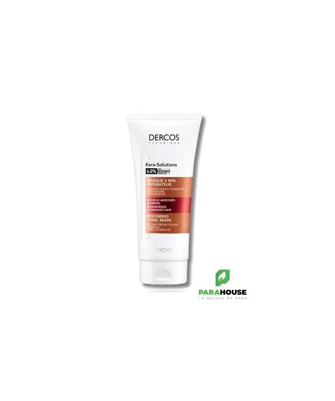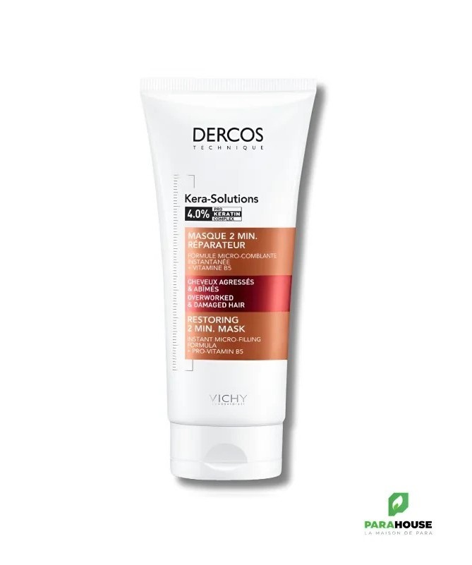 Masque Kera-Solutions 2min RéparateurLes agressions chimiques, thermiques et mécaniques fragilisent la structure du cheveu et détériorent sa kératine. Les cheveux deviennent alors ternes, cassants et rugueux.Le masque Kera-Solutions 2min Réparateur associe une formule micro-comblante au COMPLEXE PRO-KÉRATINE pour réparer et renouveler les cheveux dès la première utilisation.En complément du shampooing Kera-Solutions, il réduit de -60% les cheveux abîmés dès la première application.BénéficesRépare dès la première utilisationNourrit la fibre capillaire sans alourdirDémêle efficacementApporte douceur et brillance48h d’effet anti-humiditéIngrédients4% COMPLEXE PRO-KÉRATINE et Vitamine B5Type de cheveuxCheveux secs et abîmésConseils d'utilisationÀ utiliser plusieurs fois par semaine.