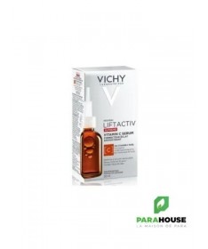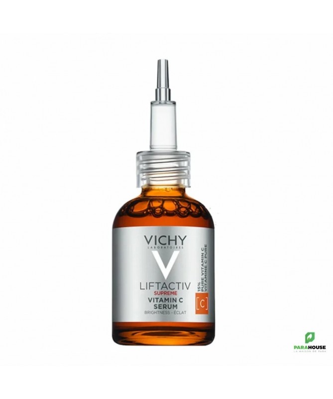 VICHY LIFTACTIV SUPREME VITAMIN C SERUM 20ML VICHY LIFTACTIV SUPREME VITAMIN C SERUM est un serum eclat anti rides avec 15 % de vitamine C pure, un puissant antioxydant qui agit à la fois sur les rides et l’éclat de la peau. Il est associé à de la vitamine E et du pycnogenol, deux antioxydants qui neutralisent les radicaux libres, et à l’eau volcanique de Vichy fortifiante. Après 10 jours seulement, le teint est plus éclatant, les rides et ridules s’atténuent et les signes de fatigue sont réduits. VICHY LIFTACTIV SUPREME VITAMIN C aide à combattre les rides et à raviver l’éclat du teint avec sa texture aqueuse et légère qui pénètre rapidement dans la peau : +40% ÉCLAT DE LA PEAU +51% UNIFORMITÉ DE LA PEAU Composition : AQUA / WATER - ASCORBIC ACID - ALCOHOL DENAT. - DIPROPYLENE GLYCOL - GLYCERIN - LAURETH-23 - NEOHESPERIDIN DIHYDROCHALCONE - SODIUM HYDROXIDE - TOCOPHEROL - HYDROLYZED HYALURONIC ACID - PINUS PINASTER BARK/BUD EXTRACT Conseils d'utilisation : Chaque matin sur peau propre et sèche, appliquez quelques gouttes du sérum VICHY LIFTACTIV SUPREME VITAMIN C sur l’ensemble du visage, en évitant les paupières. N’oubliez pas d’appliquer un soin jour quotidien avec SPF pour lutter efficacement contre les radicaux libres induits par les rayons UV. Pour compléter votre routine de soin anti-rides, vous pouvez appliquer après votre sérum une crème de jour LIFTACTIV SUPREME, suivie d’une crème solaire visage comme notre UV Age Daily.