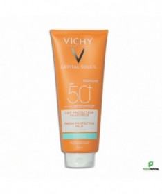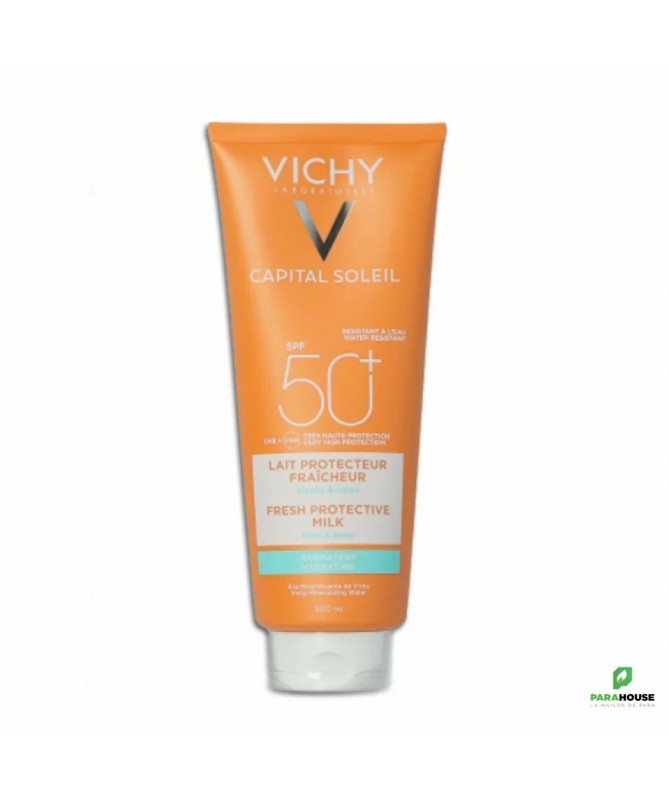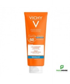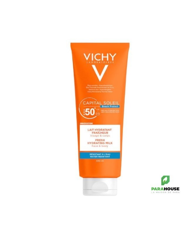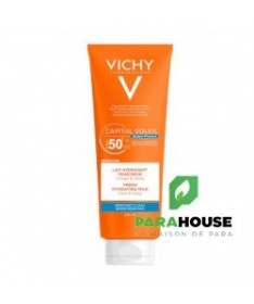 VICHY CAPITAL SOLEIL SPF50+ LAIT 300ML Peaux sensible Capital soleil Spf 50+ Résistant à l'eau Protection cellulaire profonde Visage et corps Le lait solaire Vichy IDEAL soleil SPF 50+ offre une protection cellulaire profonde à la peau contre le soleil. Il s'utilise sur le visage et le corps des adultes et des enfants, pour tous types de peaux dont peaux sensibles. Le lait hydratant VICHY CAPITAL SOLEIL SPF50+ LAIT protège toute la famille des rayons UV. Son fini est invisible, sans trace blanche et sans effet gras. Sa formule fluide et hydratante s'étale facilement sur la peau. Composition : Formule INCI: Octocrylene, Aqua, Glycerin, Propylene Glycol, Potassium Cetyl Phosphate, Synthetic Wax, Acrylates/C10-30 Alkyl Acrylate Crosspolymer, PEG-100 Stearate, Phenoxyethanol, Silica, Sodium Hyaluronate, Ethylhexyl Salicylate, Diisopropyl Sebacate, Isocetyl Stearate, Alcohol Denat, Butyl Methoxydibenzoymethane, Aluminium Starch Octenylsuccinate, Stearic Acid, Triethanolamine, Titanium Dioxide, Ethylhexyl Triazone, Caprylyl Glycol, Aluminium Hydroxide, Bis-Ethylhexyloxyphenol Methoxyphenil Triazine, Glycine Soja Oil/Soybean Oil, Palmitic Acid, Dimethicone, Disodium EDTA, Glyceryl Stearate, Terephtalylidene Dicamphor Sulfonic Acid, Tocopherol, Xanthan Gum. NB : Sans parfum, sans paraben, hypoallergénique. Conseils d'utilisation : Appliquez le produit juste avant l'exposition, renouvelez généreusement et fréquemment surtout après avoir nagé, vous être essuyé ou avoir transpiré.