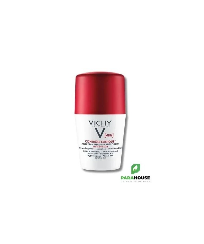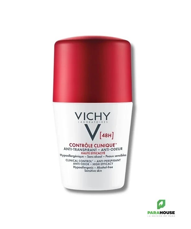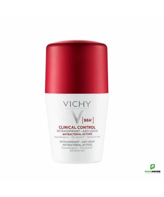 VICHY DEODORANT CLINICAL CONTROL 96H 50ML VICHY DEODORANT CLINICAL CONTROL 96H est un deodorant bille contre la transpiration excessive efficace pendant 96 heures pour tous types de peaux. Le déodorant Vichy femme Clinical Control 96h associe une tenue longue durée à une action anti-odeurs et anti-humidité grâce au zinc purifiant et antibactérien et à la perlite absorbante. Tout au long de la journée, ce déodorant prend soin de vos aisselles et laisse la peau respirer pour un confort optimal, sans effet collant, ni sensation d’irritation. Développée sous contrôle dermatologique, sa formule unique régule la transpiration et l’humidité pendant 96 heures et permet de lutter contre la transpiration excessive. Appliqué quotidiennement, le déodorant Clinical Control 96h pour femme garantit une protection extrême durant 96 heures contre les odeurs et l’humidité tout en laissant la peau respirer. Composition : AQUA / WATER - ALUMINUM CHLOROHYDRATE - DIMETHICONE - C14-22 ALCOHOLS - PARFUM / FRAGRANCE - STEARETH-100/PEG-136/HDI COPOLYMER - PERLITE - ZINC PCA - C12-20 ALKYL GLUCOSIDE - PENTYLENE GLYCOL Conseils d'utilisation : Appliquez le déodorant VICHY DEODORANT CLINICAL CONTROL 96H tous les jours sur aisselles propres et sèches. Pour prendre soin de vos aisselles sensibles, alternez son utilisation avec le déodorant minéral 48h Tolérance optimale.