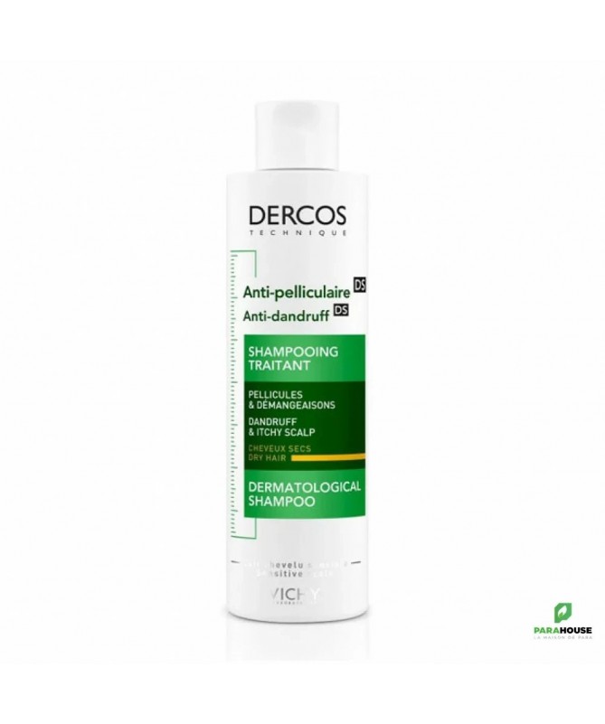 VICHY DERCOS ANTI PELLICULAIRE Shampooing traitant Cheveux secs 200ML VICHY DERCOS ANTI PELLICULAIRE Shampooing traitant Cheveux secs : Pellicules, rougeurs et démangeaisons. Cheveux secs. Anti-pelliculaire. Dépourvues de céramides, les cellules du cuir chevelu se désolidarisent en surface formant des pellicules à la base des cheveux. VICHY DERCOS ANTI PELLICULAIRE Shampooing régule le microbiome* et élimine 100% des pellicules visibles Première formule brevetée au sélénium DS (Disulfure de sélénium). Association unique de disulfure de sélénium puissant actif antipelliculaire, et de Cohesyl tm, véritable ciment d'ancrage cellulaire. Efficacité clinique prouvée. Elimination de pellicules visibles dès la 1ère application. Un cuir chevelu reconstitué et sans pellicules jusqu'à 4 semaines après arrêt du traitement. Les cheveux sont sains, fortifiés, et vigoureux. Composition : Formule INCI : Aqua (water), glycerin, dimethicone, sodium laureth sulfate, coco-betaine, carbomer, ci 19140, sodium hypochlorite, cetyl alcohol, hydroxystearyl cetyl ether, ppg-5 ceteth-20, propylene glycol, salycylic acid, yellow 5, citric acid, 2-oleamido, octadecanediol, sodium hydroxide, selenium sulfide, sodium chloride, parfum (fragrance). NB : Sans paraben. Testé sous contrôle dermatologique. Conseils d'utilisation : A la 1ère application de VICHY DERCOS ANTI PELLICULAIRE Shampooing traitant Cheveux secs, laisser poser 2mn, puis rincer. Aux shampooings suivants, masser puis rincer. Cure de 4 semaines.