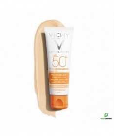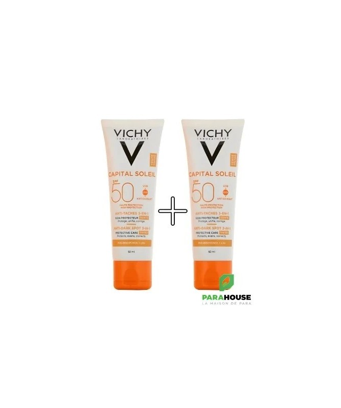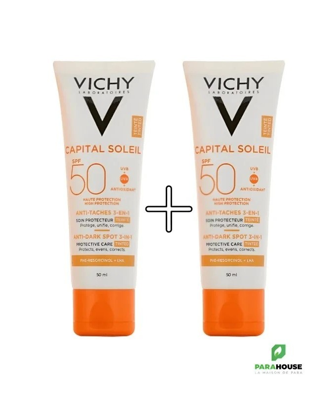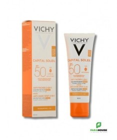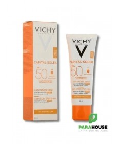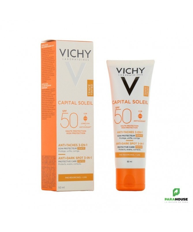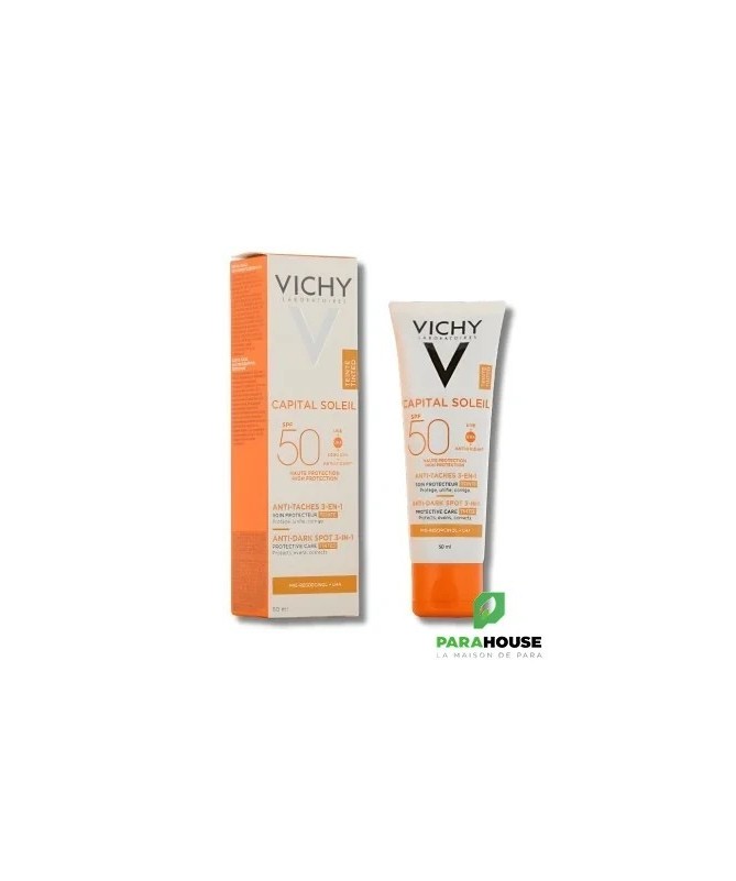 Découvrez le VICHY CAPITAL SOLEIL SOIN ANTI TACHES TEINTEE 3EN1 SPF50, une crème solaire innovante qui allie protection et correction. Spécialement formulée pour lutter contre les taches brunes tout en offrant une couvrance teintée, cette crème solaire SPF50 est l'alliée idéale pour un teint uniforme et radieux. Grâce à sa formule légère et non grasse, elle pénètre rapidement et laisse la peau douce et protégée.Ce soin anti taches teinté de Vichy est enrichi en eau thermale, offrant à votre peau une hydratation optimale tout en la protégeant des agressions extérieures. Son indice de protection élevé SPF50 garantit une défense efficace contre les rayons UVA et UVB, réduisant ainsi le risque de pigmentation et de vieillissement prématuré de la peau. Adoptez la routine beauté parfaite avec cette crème 3en1 qui illumine votre teint tout en préservant votre capital solaire.Pour une peau sublimée et protégée, choisissez le VICHY CAPITAL SOLEIL SOIN ANTI TACHES TEINTEE 3EN1 SPF50, la solution parfaite pour toutes celles qui souhaitent allier soin et beauté au quotidien.Composition :AQUA/WATER - CI 77891/TITANIUM DIOXIDE - HOMOSALATE - SILICA - ETHYLHEXYL SALICYLATE - ETHYLHEXYL TRIAZONE - C12-15 ALKYL BENZOATE - BIS-ETHYLHEXYLOXYPHENOL METHOXYPHENYL TRIAZINE - DROMETRIZOLE TRISILOXANE - BUTYL METHOXYDIBENZOYLMETHANE - GLYCERIN - ALUMINUM STARCH OCTENYLSUCCINATE - OCTOCRYLENE - PENTYLENE GLYCOL - STYRENE/ACRYLATES COPOLYMER - CI 77491, CI 77492, CI 77499/IRON OXIDES - POTASSIUM CETYL PHOSPHATE - PARFUM/FRAGRANCE - CAPRYLYL METHICONE - ACRYLATES/C10-30 ALKYL ACRYLATE CROSSPOLYMER - ALUMINUM HYDROXIDE - BUTYLENE GLYCOL - CAPRYLYL GLYCOL - CINNAMOMUM CASSIA BARK EXTRACT - DIMETHICONE - DISODIUM EDTA - INULIN LAURYL CARBAMATE - PEG-8 LAURATE - PHENOXYETHANOL - PHENYLETHYL RESORCINOL - POTERIUM OFFICINALE ROOT EXTRACT - STEARIC ACID - STEARYL ALCOHOL - TEREPHTHALYLIDENE DICAMPHOR SULFONIC ACID - TITANIUM DIOXIDE [NANO]/TITANIUM DIOXIDE - TOCOPHEROL - TRIETHANOLAMINE - XANTHAN GUM - ZINGIBER OFFICINALE ROOT EXTRACT/GINGER ROOT EXTRACT