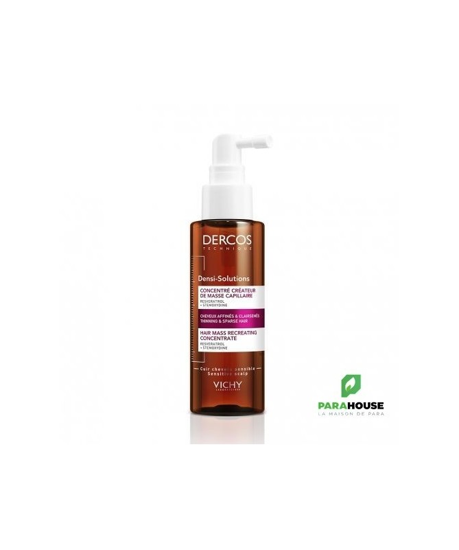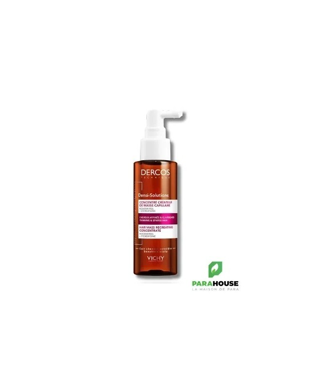 VICHY DERCOS Densi-Solutions Concentre créateur de masse capillaire VICHY DERCOS Densi Solutions Concentré créateur de masse capillaire est destiné au des femmes dont les cheveux se raréfient et manquent de force et d'épaisseur. Il a une action reconnue contre la chute de cheveux . Dercos concentré de createur masse capillaire agit au niveau du cuir chevelu pour multiplier le nombre de cheveux, pour une chevelure visiblement plus dense et plus forte. Dès 2 semaines d'application : 80% des personnes sentent une chevelure plus dense 91% des personnes des cheveux plus forts. Dès 6 semaines, la chevelure est plus dense Densi solutions dercos vichy possède une texture fluide, pour une application facile sur les racines, et une absorption rapide sans laisser de film gras ou de résidus collants. La formule est adaptée à un usage quotidien. Elle laisse un parfum tonique et une sensation de fraîcheur revigorante Composition : Alcohol denat. - aqua / water - diethyllutidinate - citral - ethyl ester of pvm/ma copolymer - geraniol - hexyl cinnamal - isoeugenol - limonene - linalool - mentha piperita oil / peppermint oil - menthol - resveratrol - rhamnose - tocopheryl acetate - parfum / fragrance Conseils d'utilisation : Diviser vos cheveux en 4 sections Appliquer 5 pressions du spray DERCOS Densi-Solutions raies par raies dans chaque section pour répartir le produit sur l'ensemble du cuir chevelu Masser pour faire pénétrer le produit et stimuler le cuir chevelu Ne pas rincer Appliquer VICHY DERCOS Densi-Solutions Concentre créateur de masse capillaire une fois par jour sur cheveux secs ou essorés pendant 6 semaines