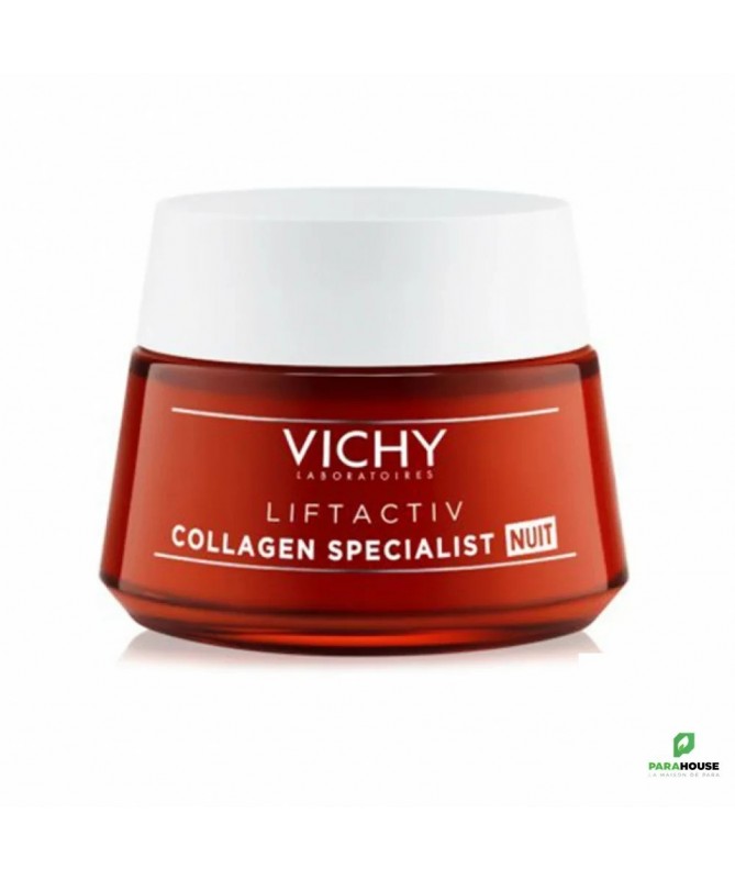 VICHY Liftactiv Collagen Specialist Creme de Nuit Anti Age VICHY Liftactiv Collagen Specialist Creme Nuit haute performance anti âge, formulée à base de Peptides raffermissants et Vitamine Cg pour renforcer l'éclat, et enrichie en Resvératrol d'origine naturelle qui protège la peau chaque nuit contre les agressions extérieures. VICHY Liftactiv Collagen Specialist Nuit est un soin réparateur, nourrissant et protecteur qui lutte contre les effets du temps en augmentant le renouvellement cellulaire, retardant l’apparition des rides et retrouvant un éclat naturel. Efficacité anti-âge prouvée et visible : +17% SOUPLESSE +16% FERMETÉ UNIFORMISE LE TEINT** POUR 79%, LA PEAU A L'AIR PLUS UNIFORME POUR 85%, LA PEAU SEMBLE PLUS LUMINEUSE Composition : INGRÉDIENTS : Peptides, Vitamine CG, Eau Volcanique de Vichy Formule INCI : Aqua/Water/Eau, Dimethicone, Dipropylene Glycol, Glycerin, Zea Mays Germ Oil/Corn Germ Oil, Elaeis Guineensis Oil/Palm Oil, Alcohol Denat., Butyrospermum Parkii Butter/Shea Butter, Glyceryl Stearate, PEG-100 Stearate, Hydroxyethylpiperazine Ethane Sulfonic Acid, Myristyl Myristate, Prunus Amygdalus Dulcis Oil/Sweet Almond Oil, Cyclodextrin, Pisum Sativum Extract/Pea Extract, Resveratrol, Adenosine, Carnosine, Pentaerythrityl Tetra-Di-T-Butyl Glucoside, Cetyl Palmitate, Citric Acid, Acrylamide/Sodium Acryloyldimethyltaurate Copolymer, Ammonium Polyacryloyldimethyl Taurate, Caprylyl Glycol, Isohexadecane, Myristic Acid, Palmitic Acid, Polysorbate 80, Sorbitan Oleate, Sorbitan Tristearate, Stearic Acid, Polysilicone-11, CI15985/Yellow 6, Phenoxyethanol, Parfum/Fragrance. Code F.I.L. B250587/1 Conseils d'utilisation : Il est conseillé d'appliquer VICHY Liftactiv Collagen Specialist Nuit le soir sur peau nettoyée. Eviter l'application de liftactiv collagen specialist nuit sur le contour des yeux. Eviter l'exposition au soleil et appliquer chaque matin un produit de photoprotection quotidienne avec un SPF