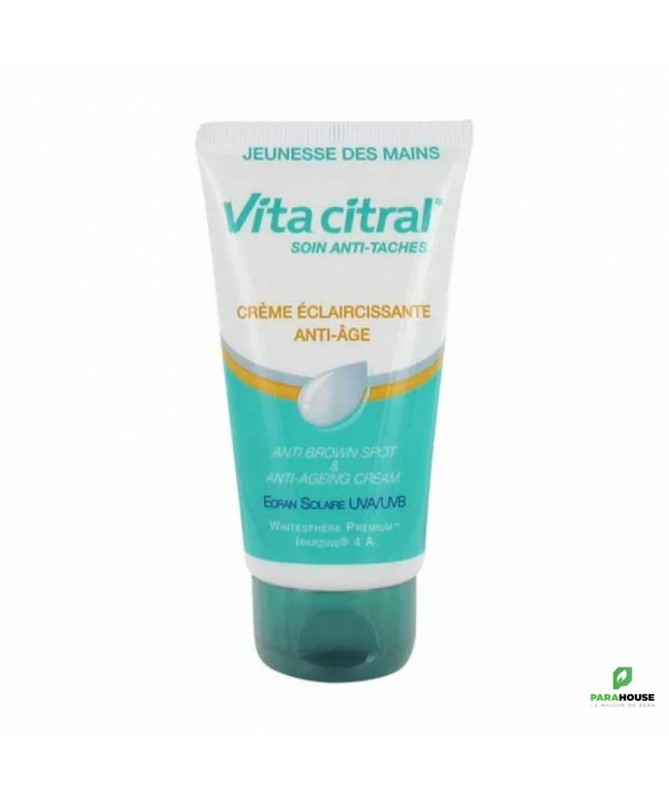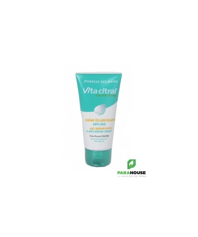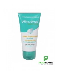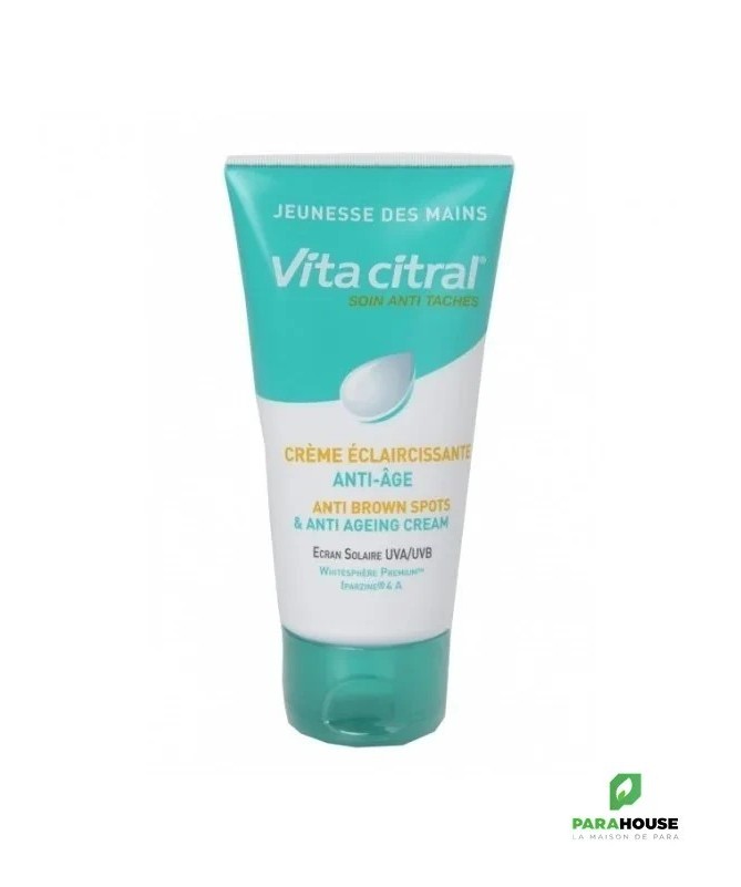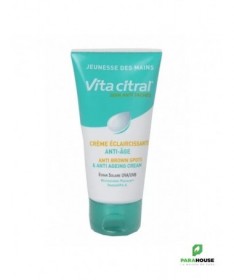 VITA CITRAL Creme Eclaircissante Mains Anti Age 75ML VITA CITRAL Creme Eclaircissante Mains Anti Age est le produit idéal pour la peau sensible des mains. Cette crème préserve le capital jeunesse de la peau, assure son hydratation puis sa protection dès la première application. Elle permet également d’estomper les taches pigmentaires de moitié en 8 semaines. Le complexe éclaircissant Whitesphere Premium combiné à l'actif anti-âge breveté Iparazine 4A permet un éclaircissement durable et visible des taches COMPOSITION : Aqua (Water), C12-15 Alkyl Benzoate, Octocrylene, Glycerin, Bis Ethylhexyloxyphenol Methoxyphenyl Triazine, Oryza Sativa (Rice) Bran Oil, Methylene Bis Benzotriazoyl TetramethylButylphenol "nano", Cetyl Alcohol, Glyceryl Stearate, Polyacrylamide, Phenoxyethanol, PEG-75 Stearate, C13-14 Isoparaffin, Sucrose Palmitate, Parfum (Fragrance), Ceteth-20, Steareth-20, Decyl Glucoside, Imidazolidinyl Urea, Dimethicone, Ethylhexylglycerin, Butylene Glycol, Glyceryl Linoleate, Prunus Amygdalus Dulcis (Sweet Almond) Oil, Laureth-7, Zinc Bis-(Methyl Palmitoyl Aspartate), Glycyrrhiza Glabra (Licorice) Root Extract, Magnesium Ascorbyl Phosphate, Lactic Acid, Propylene Glycol, Xanthan Gum, Undaria Pinnatifida Extract, Tocopherol, Benzyl Benzoate, Benzyl Alcohol. Conseils d'utilisation : Il est recommandé d'appliquer VITA CITRAL Creme Eclaircissante Mains Anti Age deux fois par jour pendant au moins 60 jours. Il est important d'éviter le contact avec les yeux. Usage externe.