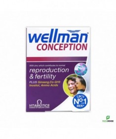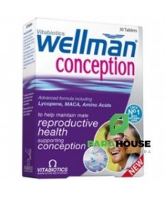 VITABIOTICS Wellman Conception - 30 Comprimés VITABIOTICS Wellman Conception soutient l'alimentation pour une fertilité et une reproduction normales, et est spécialement conçu pour les hommes. Ce complément possède une formule complète contennant du zinc qui contribue à une fertilité et une reproduction normales, et au maintien d'une testostérone normale avec également du sélénium, du ginseng, du Co-Q10, de l'inositol et de la maca péruvienne. Composition : ZINC : Pour le maintien de niveaux normaux de testostérone dans le sang SÉLÉNIUM : Ce qui contribue à une spermatogenèse normale VITAMINE B6 : Contribue à la régulation de l'activité hormonale VITAMINE D : Contribue au fonctionnement normal du système immunitaire NUTRIMENTS DE SOUTIEN : Ginseng de Sibérie, Maca péruvienne et Co-Q10 Maltodextrin, Bulking Agent: Microcrystalline Cellulose, Vitamin C (Ascorbic Acid [Hydroxypropylmethylcellulose & Tartaric Acid]), Magnesium Oxide, L-Carnitine Tartrate, Inositol (Carrier: Acacia Gum) Vitamin E (D-Alpha Tocopheryl Acid Succinate) (from Soya), Maca Extract, Zinc Sulphate, Tablet Coating: (Hydroxypropylmethylcellulose, Glycerin, Natural Source Colours [Iron Oxides]), Crosslinked Cellulose Gum, Pine Bark Extract, Anti-Caking Agents: Stearic Acid, Magnesium Stearate & Silicon Dioxide, Thiamin (Vitamin B1 as Mononitrate [Carrier: Hydroxypropylmethylcellulose]), Niacin (as Nicotinamide), Ferrous Fumarate, Citrus Bioflavonoids, Vitamin B6 (Pyridoxine HCl), Pantothenic Acid (as Calcium Salt), L-Arginine, Vitamin A (as Acetate [Carriers: Acacia, Starch, Maltodextrin, Antioxidants: DL-Alpha Tocopherol]), Vitamin D3 (Cholecalciferol [Carriers: Acacia, Sucrose, Corn Starch, Medium Chain Triglycerides, Antioxidant: DL-Alpha Tocopherol]), Siberian Ginseng Extract, Riboflavin, Octacosanol (Rice Bran), Copper Sulphate, L-Glutathione, Co-Enzyme Q10, Manganese Sulphate, Lycopene Extract, Folic Acid (as Pteroylmonoglutamic Acid), Sodium Selenate, Chromium Trichloride, Biotin, Vitamin B12 (Cyanocobalamin). Convient aux végétariens Sans gluten Pas de colorants artificiels Aucun agent de conservation Pas de levure Conseils d'utilisation: Il est recommandé de prendre UN COMPRIMÉ PAR JOUR AVEC VOTRE REPAS PRINCIPAL Avalez avec de l'eau ou une boisson fraîche. A ne pas mâcher. Ne pas dépasser les apports recommandés. A prendre l'estomac plein. A conserver à une température inférieure à 25°C dans un endroit sec.