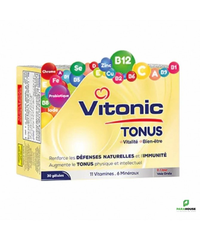 VITONIC TONUS - 30 Gelules VITONIC TONUS e st un complément alimentaire qui fournit des vitamines et minéraux essentiels dont le corps a besoin pour maintenir un mode de vie sain et actif. Il permet d'améliorer l'immunité, la vitalité et le tonus procuarant un apaisement pour tous le corps. Composition: Vitamine C, Vitamine A, Vitamine B6 , Vitamine B2, Vitamine B1, Vitamine B12, Vitamine E, Cuivre, Fer, Vitamine B5, Vitamine D, Vitamine B9, Chrome, Vitamine , Sélénium, Zinc, Iode, Probiotique Posiologie : Il est recommandé de prendre 1 gélule de VITONIC TONUS le matin et 1 gélule la nuit
