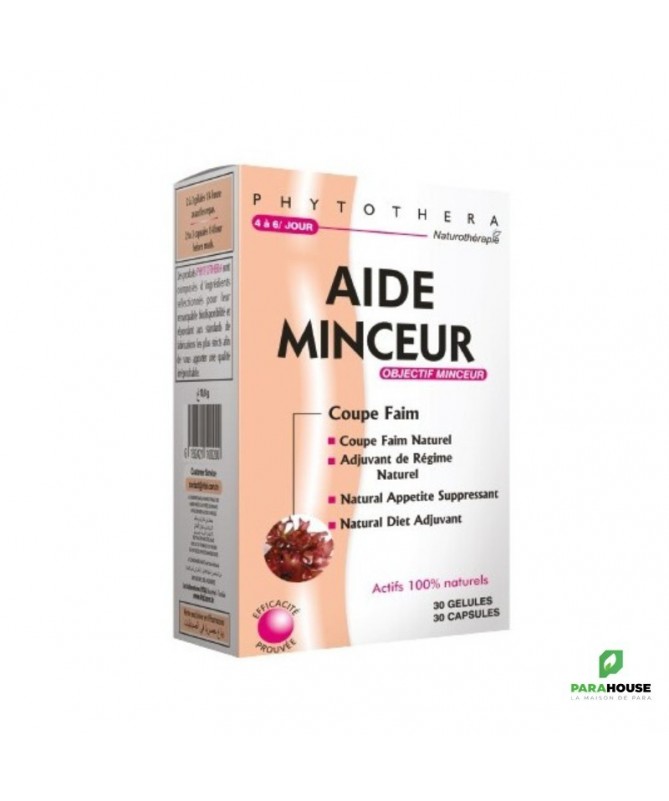 DescriptionPhytothera Aide Minceur est un complément alimentaire innovant conçu pour accompagner vos efforts de gestion du poids et favoriser une sensation de satiété. Grâce à sa formule à base d'agar-agar, un ingrédient d'origine naturelle reconnu pour ses propriétés gélifiantes, ce produit aide à réduire l'appétit en formant un gel dans l'estomac, contribuant ainsi à limiter les fringales.Bienfaits :Réduction de l'appétit : Le principal atout de Phytothera Aide Minceur est sa capacité à générer une sensation de satiété, ce qui peut faciliter la gestion de l'alimentation quotidienne.Favorise le contrôle du poids : En complément d'un mode de vie sain, ce produit aide à soutenir les objectifs de perte de poids.Ingrédient naturel : L'agar-agar, présent dans la composition, est une fibre naturelle qui capte l'eau et gonfle dans l'estomac, agissant ainsi comme un coupe-faim efficace.Utilisation recommandée : Prendre 2 à 3 gélules par jour, environ 15 minutes avant les repas, avec un grand verre d’eau. Cela permet d'optimiser l’effet coupe-faim et de mieux contrôler les portions alimentaires.Précautions :À utiliser avec une alimentation équilibrée et un mode de vie actif.Ne pas dépasser la dose recommandée.Ce produit est déconseillé en cas d’hyperthyroïdie ou d’acné.Conseils d'utilisation :Pour de meilleurs résultats, associez l’utilisation de Phytothera Aide Minceur à un programme de régime alimentaire équilibré et à une activité physique régulière.Composition:Agar-agar : source naturelle de fibres.Autres composants pour la formulation (détails disponibles sur la notice).Format : Boîte de 30 gélules, idéale pour une cure d'un mois.