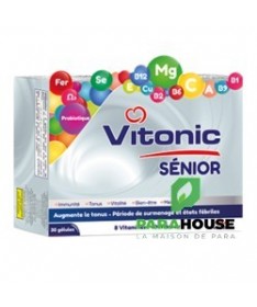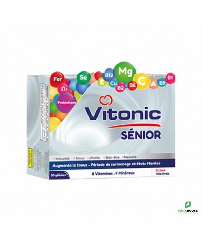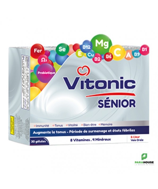 VITONIC SENIOR (Gélules) Trouble de la mémoire (surmenage intellectuel, stress). L'asthénie et la fatigue physique, sénescence. Renforcement des défenses naturelles. Composition: Carbonate de magnésium, acide ascorbique, nicotinamide, cyancobalamine, sorbate potassium, benzoate de sodium, fer fumarate, tocophérol acétate, cuivre sulfate, pyroxidine, betatab, sélénomathionine, acide folique,riboflavine, thiamine, Probiotique. Posiologie: 2 gélules de VITONIC SENIOR par jour à avaler de préférence, au moment des repas avec un verre d’eau , pendant 3 à 8 semaines.