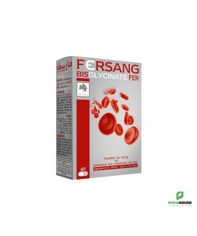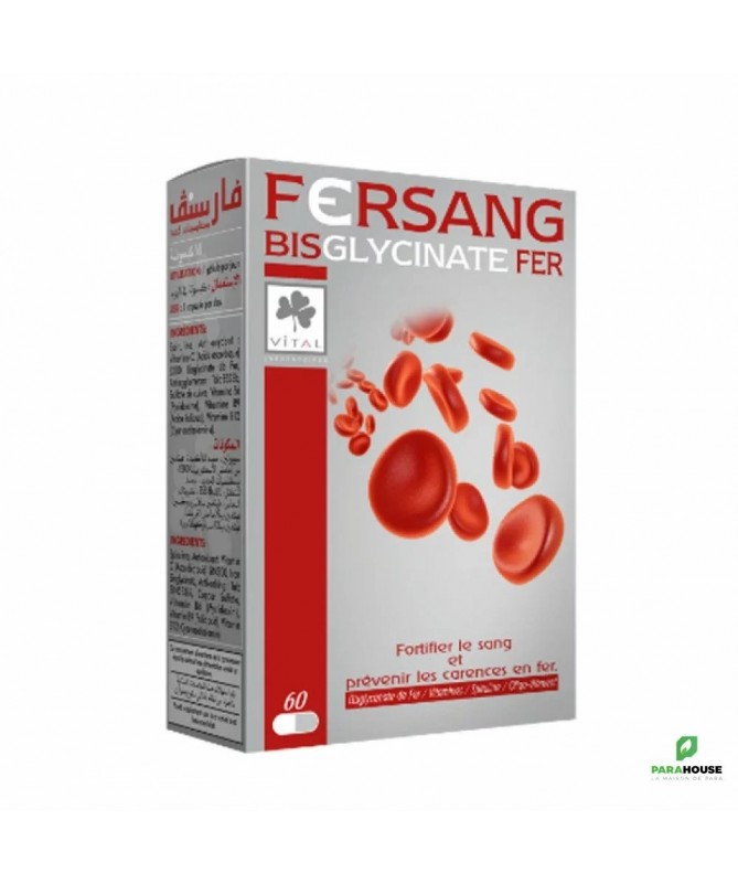 VITAL FERSANG Bisglycinate de Fer 60 Gelules VITAL FERSANG Bisglycinate de Fer : Prévention de la carence martiale Traitement de l’anémie chez l’adulte, l’enfant et la femme enceinte Restitution des réserves en fer Réduit le risque de constipation Fortifie le sang Composition : Spiruline, Vitamine C, Fer (bisglycinate de fer), Cuivre, Vitamine B6, Vitamine B9, Vitamine B12 Conseils d'utilisation : Il est recommande de prendre 1 gélule de VITAL FERSANG par jour