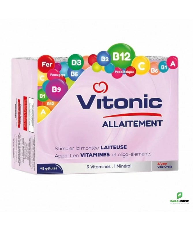 VITONIC ALLAITEMENT VITONIC ALLAITEMENT contribue au bien-être et à la vitalité, stimule la montée laiteuse, réponds aux besoins spécifiques de la femme allaitante, contribue à la croissance du bébé, pallie certaines carences en vitamines. C omposition: calcium carbonate, acide ascorbique, nicotinamide,lactose,extrait sec de galega officinalis, Pyroxidine, riboflavine, fer fumarate, agent de surface (talc), thiamine, betatab, acide folique, molybdate sodium, cyanocobalamine, Probiotique. Posiologie: 3 gélules de VITONIC ALLAITEMENTpar jour à avaler de préférence, au moment des repas avec un verre d’eau , ce produit contient spécifiquement un extrait de Galéga officinal aux propriétés galactogènes