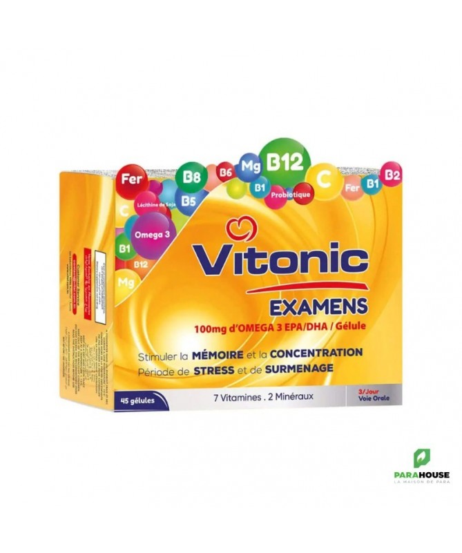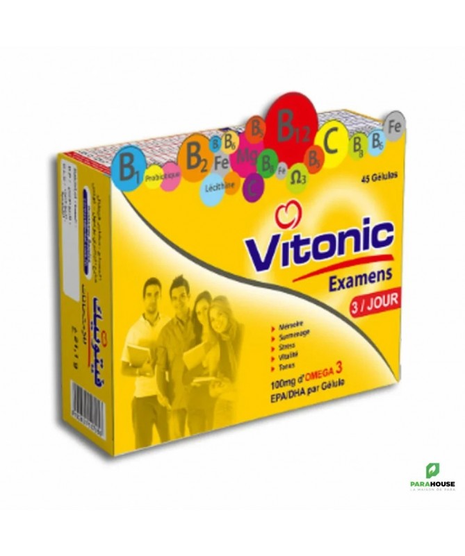 Description :Le VITONIC Examens B/45 Gélules est un complément alimentaire spécialement conçu pour améliorer la mémoire et la concentration lors de périodes d'examens ou de stress intense. Grâce à sa formule unique à base de vitamines B, de magnésium et de plantes adaptogènes telles que le ginseng, le rhodiola et le bacopa monnieri, ce produit aide à renforcer les capacités cognitives et à optimiser les performances mentales. Les gélules sont faciles à avaler et peuvent être prises quotidiennement pour soutenir le fonctionnement normal du cerveau. Faites confiance à VITONIC Examens B/45 Gélules pour vous accompagner efficacement dans vos moments d'examens et de stress.Indication :Stimuler la mémoire et la concentration.Période de stress et de surmenage.Diminuer la fatigue.Conseils d'utilisation :- Prendre 1 à 2 gélules par jour, de préférence le matin avec un grand verre d'eau.- Ne pas dépasser la dose journalière recommandée.- Ce complément alimentaire n'est pas un substitut à une alimentation variée et équilibrée.- Tenir hors de portée des enfants.- Conserver dans un endroit frais et sec.Composition :- Extrait de ginkgo biloba- L-phosphatidylsérine- Vitamine B5- Vitamine B6- Zinc- Huile de poisson- Lutéine- Vitamine E- Sélénium- Vitamine D3- Extrait de bacopa monnieri