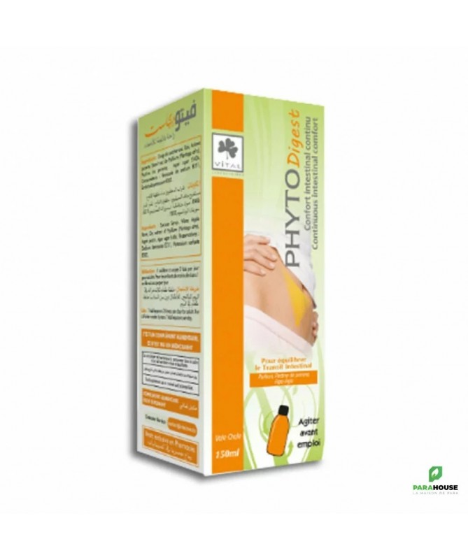 VITAL PHYTODIGEST Sirop 150ML VITAL PHYTODIGEST Sirop est un complément alimentaire conçu pour favoriser un système digestif sain. Le produit est un mélange exclusif d'extraits de plantes qui ont utilisés pour maintenir le système digestif en exerçant une action laxative lubrifiante douce pour soulager la constipation chronique. Composition : Extrait sec de Psyllium, Agar agar, Pectine de pomme Conseils d'utilisation : Adulte 10 ml 3 fois par jour avant les repas Enfants plus de 6 ans 10ml 1 fois par jour avant les repas Ne pas prendre en cas de sténose intestinale ou oesophagienne et d'hyperthyroïdie