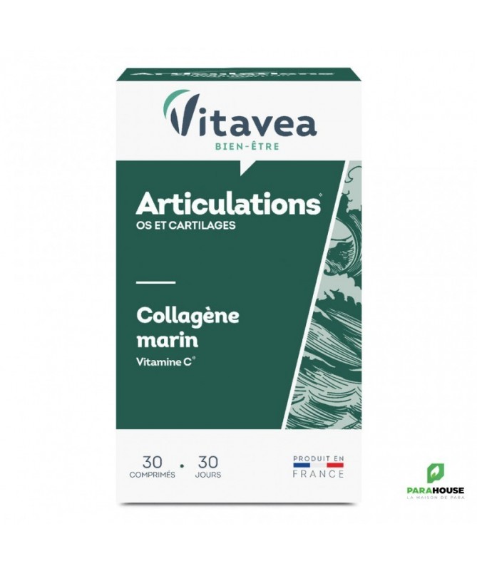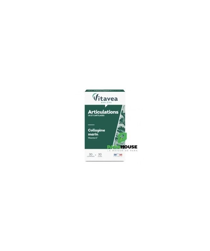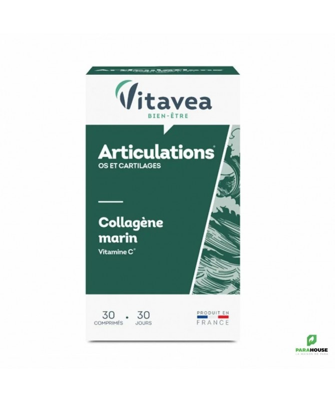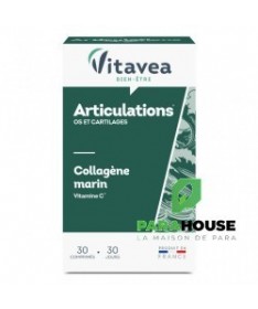 VITAVEA Articulations Os et Cartilages 30 Comprimes : collagène marin La formule VITAVEA collagène marin associe du collagène à de la vitamine C. VITAVEA Collagène Marin Vitamine C contibue à la formation normale du collagène afin d'assurer la fonction normale du cartilage. Elle protége aussi l'organisme des radicaux libres, responsables du stress oxydatif. Conseils d'utilisation : Il est conseillé de prendre 1 gélule par jour le soir au moment du repas, à avaler avec un verre d’eau. La cure doit être de 30 jours, à renouveler selon le besoin. Précautions d'emploi : VITAVEA Articulations doit être consommé dans le cadre d’une alimentation variée et équilibrée et d’un mode de vie sain. Il ne faut pas dépasser la dose recommandée. Il doit être conservé dans un endroit sec et frais. Il est indiqqué de le garder hors de portée des enfants. Composition: VITAVEA Articulations Os et Cartilages est un complément alimentaire à base de collagène issu de poisson et de vitamine C. Ingrédients: Hydrolysat de cartilage de poisson (Centrophorus squamosus) ; vitamine C ; maltodextrine ; gélule (gélatine) ; agent de charge : cellulose ; anti-agglomérants : sels de magnésium d’acides gras, dioxyde de silicium.