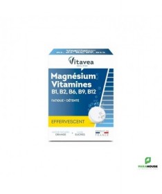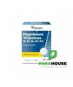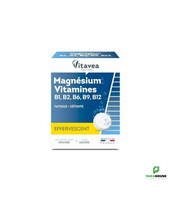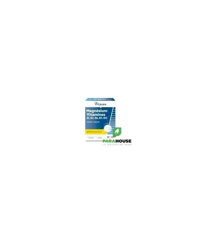 VITAVEA Magnésium + vitamines B1, B2, B6, B9, B12 est une association de magnésium et de vitamines de groupe B qui servent à retrouver l’équilibre nerveux et à favoriser la détente.Le magnésium favorise la détente et contribue à réduire la fatigue.Les vitamines B1, B2, B6, B9 et B12 permettent de lutter contre la fatigue passagère et participe au métabolisme énergétique normal.Composition :Édulcorant : sorbitol ; acidifiant : acide citrique ; minéral : oxyde de magnésium ; correcteur d’acidité : bicarbonate de sodium ; arôme naturel d’orange ; anti-agglomérant : polyéthylène glycol ; édulcorant : saccharine ; vitamines : B1, B2, B6, B12 ; édulcorants : acésulfame de potassium, glycosides de stéviol ; vitamine B9.