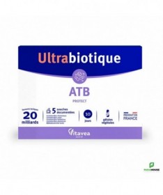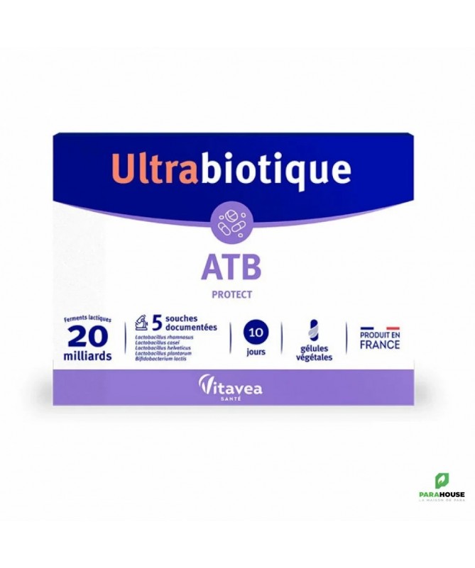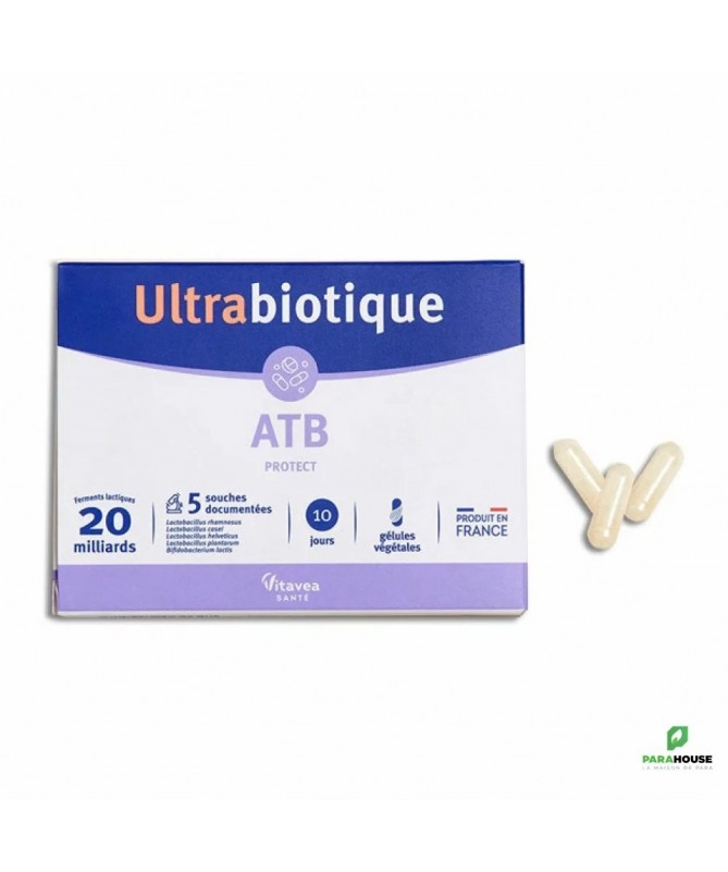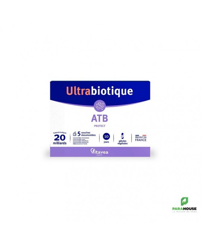 DESCRIPTION:Vitavea Ultrabiotique ATB Protect 10 Gélules Végétales est un complément alimentaire qui associe 5 souches de ferments lactiques pour préserver l'équilibre de la flore intestinale.Alimentation, changements de rythme, stress peuvent impacter l'équilibre de la flore intestinale. Pour lutter contre ce déséquilibre, ce complément alimentaire apporte :Une association complémentaire des meilleures souches de ferments lactiques.Un haut dosage : 20 Milliards de ferments lactiques.Des souches scientifiquement documentées.Des souches gastro-résistantes : elles résistent à l'acidité gastrique et aux sels biliaires. Elles arrivent ensuite vivantes dans l'intestin.Une capacité d'adhésion aux cellules épithéliales pour une bonne colonisation intestinale.CONSEIL D'UTILISATION:1 gélule par jour à avaler avec un verre d'eau, de préférence pendant un repas.Il est possible d'ouvrir la gélule et de mélanger la poudre à l'alimentation (compote, yaourt ...).Ne pas dépasser la dose journalière recommandée. Garder hors de portée des enfants.A consommer dans le cadre d'une alimentation variée et équilibrée et d'un mode de vie sain.A conserver dans un endroit sec et frais.Indication :Équilibre de la flore intestinale.COMPOSITION:Maltodextrine, Complexe de micro-organismes, Lactobacillus Rhamnosus, Lactobacillus Casei, Lactobacillus Helveticus, Lactobacillus Plantarum, Bifidobacterium Lactis, Gélule d'origine végétale (dérivé de cellulose), Anti-agglomérant : Sels de magnésium d'acides gras ; Antioxydant : Acide ascorbique.Contient des traces de lait et soja.