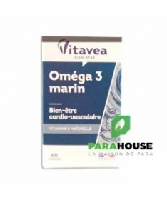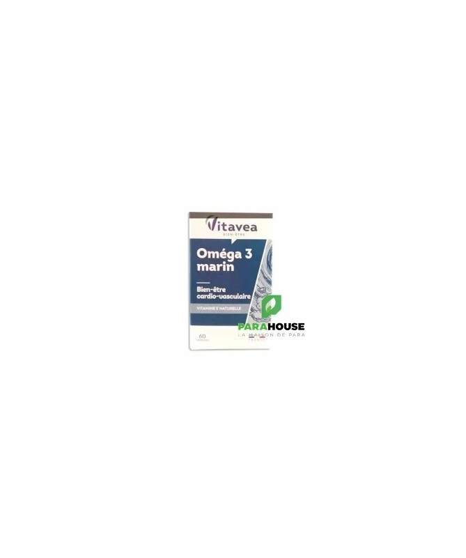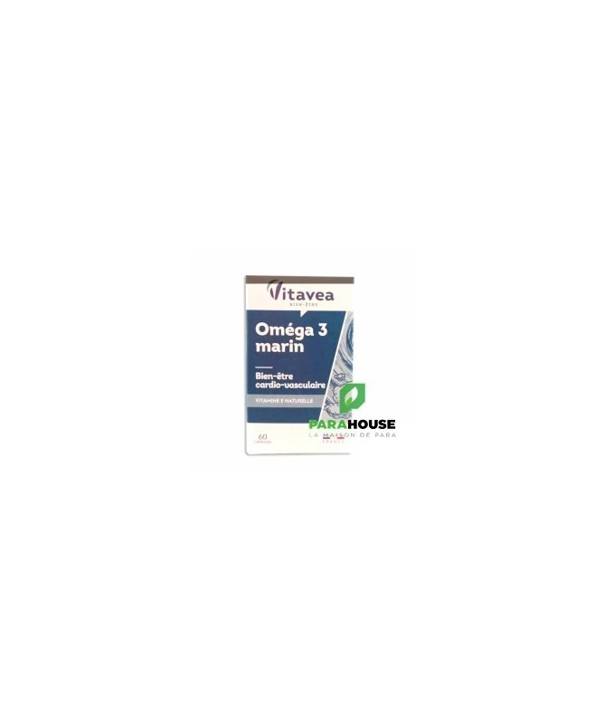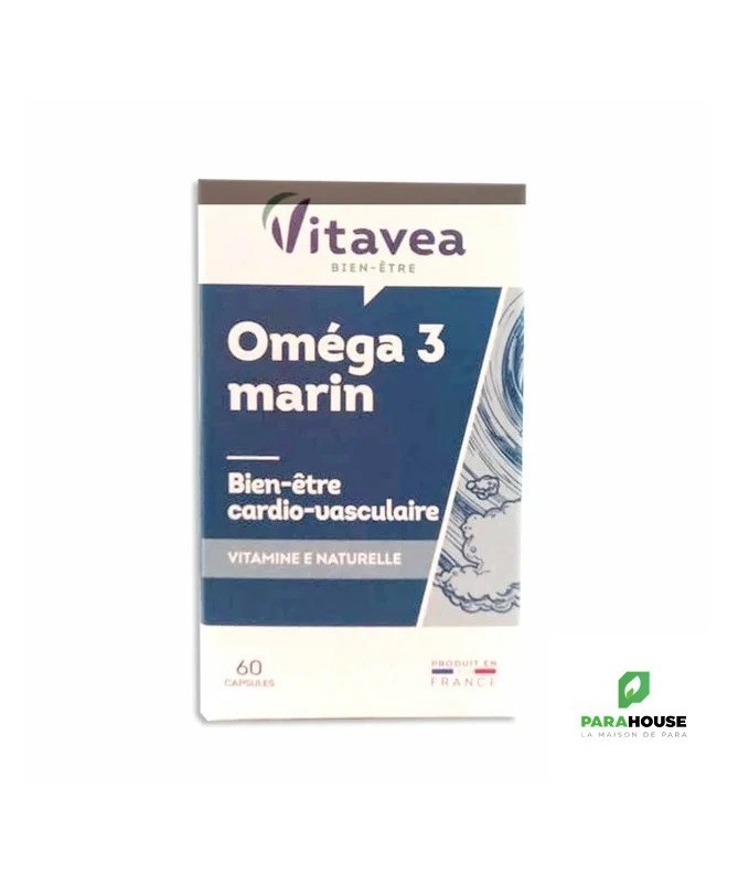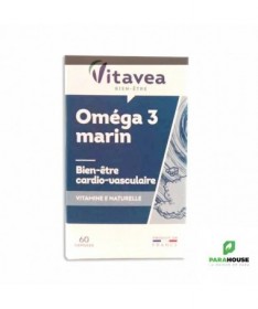 VITAVEA Panier d'actifs - Oméga 3 Marin VITAVEA Oméga 3 Marin est un complement alimentaire qui aide à maintenir un bon équilibre cardio-vasculaire. L’effet bénéfique sur le fonctionnement normal du cœur est obtenu par la consommation journalière de 250 mg d’EPA et de DHA. Présents dans les huiles de poissons des mers froides, les oméga 3 à longues chaînes (EPA et DHA) permettent d'exercer une action bienfaisante sur le cœur et les artères. Conseils d'utilisation: Il est conseillé de prendre 1 capsule de VITAVEA Oméga 3 Marin midi et soir pendant le repas, à avaler avec un verre d’eau. Une cure d'un mois à renouveler selon le besoin. Précautions d'emploi : VITAVEA Oméga 3 Marin doit être consommé dans le cadre d’une alimentation variée et équilibrée et d’un mode de vie sain. Il ne faut pas dépasser la dose recommandée. Il doit être conservé dans un endroit sec et frais. Il est indiqqué de le garder hors de portée des enfants. Composition: VITAVEA Oméga 3 Marin est un complément alimentaire à base d’oméga 3 et de vitamine E naturelle. Ingrédients Huile de poissons riche en oméga 3 ; capsule (gélatine, stabilisant : glycérol) ; vitamine E naturelle. 2 capsules apportent 437 mg d'oméga 3 dont 218 mg d'EPA et 145 mg de DHA et 10 mg de vitamine E (83.3 % des VNR*). *VNR = Valeurs nutritionnelles de référence