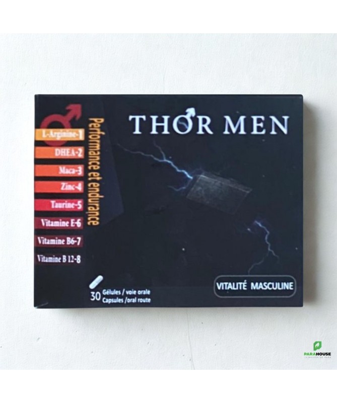 XEN THOR MEN 30 Gelules XEN THOR MEN est un complément alimentaire spécialement formulé pour soutenir la vitalité masculine, l’endurance physique et le bien-être général. Sa formule complète associe L-Arginine, DHEA, extrait de Maca, Taurine, Vitamines et Zinc, des actifs reconnus pour leurs effets bénéfiques sur l’énergie, la performance et la libido. Bienfait de Thor men : Améliore la vitalité et les performances physiques Favorise la circulation sanguine et l’endurance Soutient la production hormonale masculine Contribue à réduire la fatigue et à renforcer le tonus Stimule la libido et la fertilité masculine Composition : L-Arginine : Cet acide aminé est un précurseur du monoxyde d'azote, essentiel pour une vasodilatation optimale et une circulation sanguine améliorée, soutenant directement la fonction érectile. Il contribue également à la santé cardiovasculaire globale, un pilier de la vitalité masculine. Maca : Cette racine adaptogène est réputée pour stimuler la libido et améliorer l'endurance, agissant sur l'équilibre hormonal sans être un hormone elle-même. Elle soutient également l'énergie, la récupération et peut avoir un effet positif sur la qualité du sperme. Taurine : Cet autre acide aminé joue un rôle crucial dans la santé cardiaque et la fonction musculaire, soutenant l'énergie et l'endurance physique. Elle possède également des propriétés antioxydantes qui protègent les cellules reproductrices du stress oxydatif. DHEA (Déhydroépiandrostérone) : Cette hormone précurseure décline avec l'âge et sa supplémentation peut aider à restaurer des niveaux de testostérone optimaux, boostant ainsi la libido et l'énergie. Elle soutient la composition corporelle (masse musculaire) et le bien-être général. Vitamine E : Puissant antioxydant, elle protège spécifiquement les membranes des spermatozoïdes des dommages oxydatifs, améliorant ainsi leur intégrité et leur mobilité. Elle contribue également à une circulation sanguine saine, essentielle à la fonction sexuelle. Zinc : Minéral fondamental, il est directement impliqué dans la synthèse de la testostérone et la spermatogenèse. Un statut optimal en zinc est corrélé à un volume séminal, une motilité et une qualité spermatique améliorés. Vitamine B6 : Elle est essentielle à la régulation des hormones stéroïdiennes, dont la testostérone, et aide à moduler les niveaux de prolactine, une hormone qui peut inhiber la libido si elle est trop élevée. Elle soutient également la production d'énergie et la fonction nerveuse. Vitamine B12 : Cruciale pour la production d'énergie cellulaire et la formation des globules rouges, elle lutte contre la fatigue et soutient l'endurance. Elle joue également un rôle dans la synthèse de l'ADN, impactant la qualité et la production des spermatozoïdes. Conseils d’utilisation : Prendre 2 gélules par jour, de préférence au cours des repas avec un grand verre d’eau. À utiliser en complément d’une alimentation variée, équilibrée et d’un mode de vie sain. Réservé à l’adulte. Ne pas dépasser la dose journalière recommandée. Tenir hors de portée des enfants.