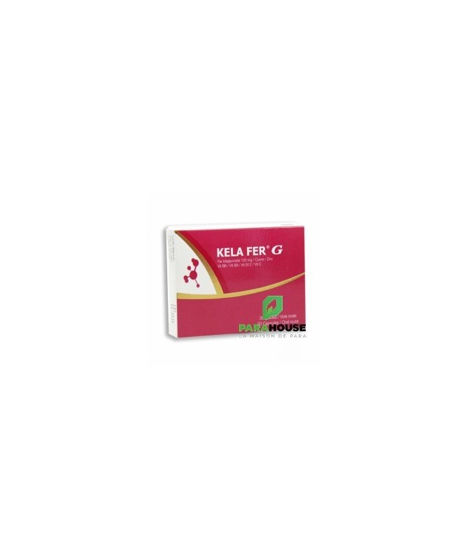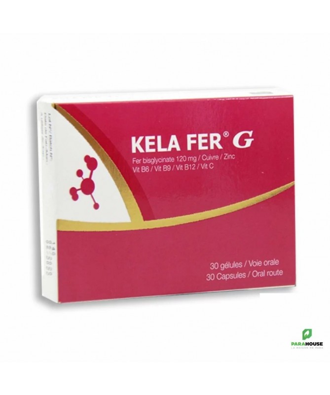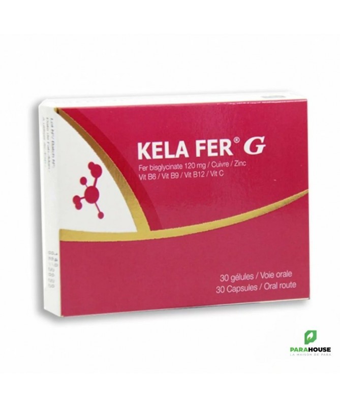 KELA FER G 30 capsules KELA FER G 30 capsules de nouvelle génération est un supplément de fer de nouvelle génération. Spécialement conçu pour avoir une meilleure absorption du fer et une meilleure tolérance digestive, il contient du zinc, du cuivre, des vitamines B6, B9, B12 et C. Conseils d'utilisation : Il est recommandé de prendre 1 capsule par jour. Avant de commencer à prendre KELA FER G, veuillez consulter votre médecin concernant les risques et les avantages du traitement. N’utilisez pas ce complément alimentaire si vous êtes allergique à l’un de ses constituants. En cas de surdosage du produit ou de prise supérieure à la dose recommandée, contactez immédiatement votre médecin. Conservez toujours ce complément alimentaire hors de portée des enfants dans un endroit protégé de l’humidité et à une température qui ne dépasse pas 25°C.