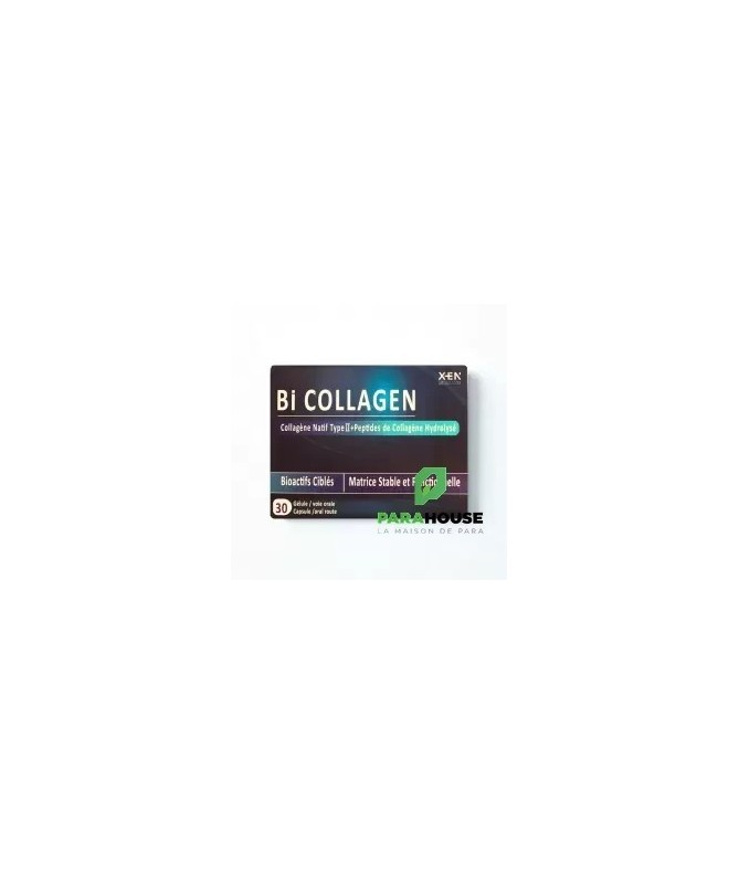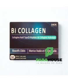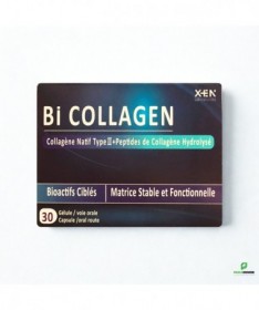 Description :BI COLLAGEN se présente sous forme d'une boite de 30 gélules, sans dioxyde de titane.DANS QUELS CAS UTILISER CE COMPLEMENT ALIMENTAIRE?BI COLLAGEN est un complément alimentaire à base d'une association de collagène natif type II et de collagène marin hydrolysé, recommandé pour le Soulagement de la douleur et de la gène fonctionnelle au cours de L'arthrose du genou et de la hanche-Collagène natif type II: aide à bloquer la dégénérescence du cartilage desgenoux et de la hanche en stimulant la réponse immunitaire induisant l'arrêt du mécanisme de destruction. Il aide aussi à réduire la sensation de gène et de douleurs en réduisant l'effet de la réponse pro inflammatoiredu système immunitaire. -Collagène hydrolysé marin: aide à protéger le cartilage, les ligaments et lestendons en stimulant la réparation des tendons et ligaments par synthèse protéique et à réduire la sensation de gène et de douleurs en réduisant l'effet de la réponse pro inflammatoire du système immunitaire.Mode D'emploi :Voie d'administration: Voie orale uniquement.Conseils d'utilisation :-Il est recommandé de prendre quotidiennement, 1 à 2 gélules, au cours des repas et avec un verre d'eau.-A utiliser en complément d'une alimentation variée, équilibrée et d'un mode de vie sain.Durée d'utilisation: Suivre les recommandations de votre professionnel de santé.Lisez attentivement