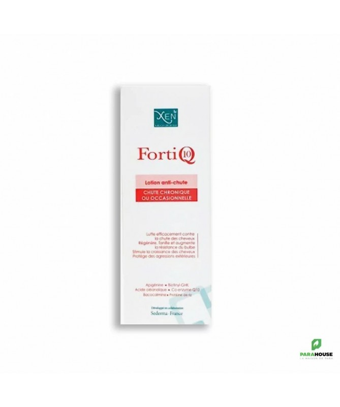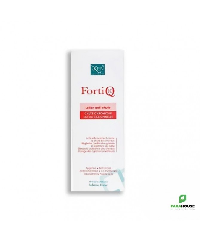 XEN FORTI Q10 LOTION ANTI CHUTE 100ML XEN FORTI Q10 LOTION ANTI CHUTE comprend une formule complète d’actifs pouvant interagir entre eux et agir en synergie. Elle contient des actifs naturels dont les propriétés sont connues, et qui ont fait leurs preuves dans la clinique. La lotion Forti Q10 aide à prévenir la chute des cheveux due à la folliculite, à l'inhibition de la 5 aplpha-réductase, aux effets négatifs de la DHT, à une mauvaise microcirculation folliculaire et accélère le métabolisme. Cette solution cible les principales causes de l’alopécie, telles que la micro-circulation, l’atrophie du follicule, la dihydrotestostérone, le vieillissement folliculaire et d’autres facteurs qui affectent la santé et la croissance des cheveux. Composée d’une forte concentration d’actifs naturels soigneusement sélectionnés, cette lotion agit de manière complémentaire et synergique pour renforcer les cheveux, stimuler leur croissance et réduire la chute des cheveux. Composition : Elle contient des ingrédients actifs tels que l’acide oléanolique, l’apigénine et le biotinyl-GHK, qui agissent en harmonie pour améliorer la micro-circulation, stimuler le métabolisme cellulaire, inhiber la production de dihydrotestostérone et renforcer la structure du cheveu. la pogaine améliore la microcirculation et le biotayn-GHK module le métabolisme cellulaire pour le ramener à un niveau jeune. Conseils d'utilisation : Pour une cure d’attaque, l’application quotidienne de XEN FORTI Q10 est recommandée pendant au moins un mois, tandis que pour l’entretien, l’application doit être effectuée trois fois par semaine pendant un minimum de trois mois. L’utilisation de la lotion est simple. Il suffit de pulvériser 15 fois (1,5 ml) sur le cuir chevelu sec ou légèrement humide, puis de masser légèrement pour bien répartir le produit. Il n’est pas nécessaire de rincer après l’application.