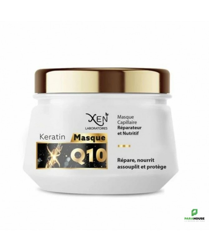 XEN KERATIN Q10 MASQUE 250ML XEN KERATIN Q10 MASQUE est un soin nourrissant exceptionnel qui combine des traitements de nutrition et de réparation conçus pour nourrir, réparer et renforcer l'effet lissant des cheveux secs, abîmés, cassés, difficiles à manipuler et soumis à de multiples agressions (brossages, lavages, coloration, séchage...). Résultats Répare, nourrit intensément, renforce et protège les cheveux. Lisse la fibre capillaire pour assouplir les cheveux et faciliter le démelage. Détend les cheveux en éliminant les frisottis. Chevelure sublimée, redensifiée, brillante et éclatant Composition : kératine végétale, beurre de karité, huile de pépins de raisins, huile de Macadamia, Coenzyme Q10. Conseils d'utilisation : L’application du Masque Keratin Q10 est simple et facile. Il suffit d’appliquer le masque sur cheveux humides et de laisser poser pendant 10 à 15 minutes avant de rincer abondamment. Avec une utilisation régulière, les résultats seront visibles et durables. Offrez à vos cheveux le soin qu’ils méritent avec le Masque Kératin Q10.