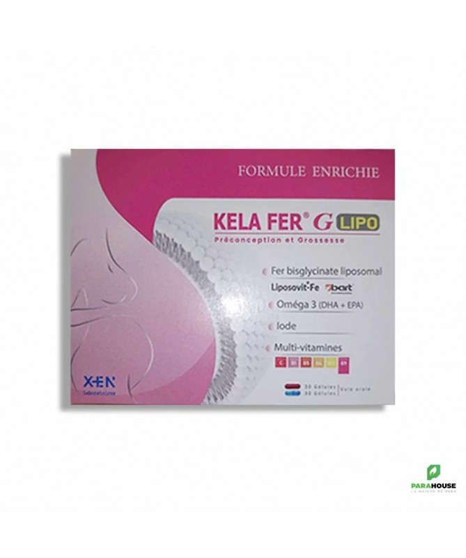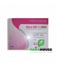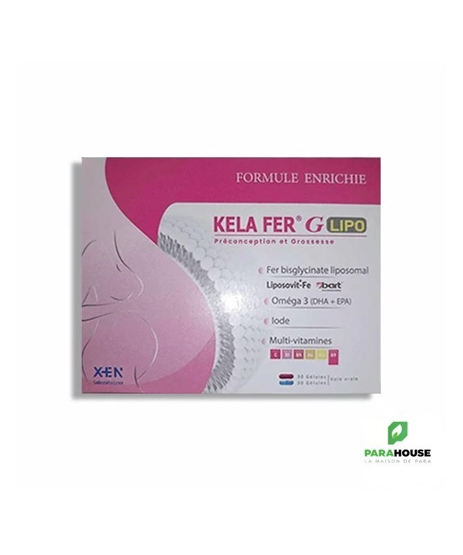 KELA FER G LIPO - 60 capsules KELA FER G LIPO est un complément alimentaire spécialement conçu pour les périodes de préconception et de grossesse. Sa formule unique contient : Fer bisglycinate liposomal : une forme de fer hautement biodisponible et facilement absorbée par l'organisme, essentielle pour prévenir l'anémie ferriprive chez la mère et assurer le bon développement du fœtus. Oméga-3 : des acides gras essentiels qui soutiennent la santé cardiovasculaire, le développement neurologique du bébé et contribuent à réduire l'inflammation. Iode : un minéral crucial pour le bon fonctionnement de la glande thyroïde, particulièrement important pendant la grossesse pour le développement cérébral du bébé. Multivitamines : une combinaison de vitamines essentielles telles que la vitamine C, B1, B5, B6, B12 et B9 (acide folique), qui soutiennent le système immunitaire, le métabolisme énergétique, la formation des globules rouges et la santé générale de la mère et du bébé. Ce complément alimentaire aide à couvrir les besoins nutritionnels accrus pendant la période de préconception et tout au long de la grossesse. Conseils d'utilisation : Il est recommandé de prendre 1 capsule par jour. Avant de commencer à prendre KELA FER G, veuillez consulter votre médecin concernant les risques et les avantages du traitement. N’utilisez pas ce complément alimentaire si vous êtes allergique à l’un de ses constituants. En cas de surdosage du produit ou de prise supérieure à la dose recommandée, contactez immédiatement votre médecin. Conservez toujours ce complément alimentaire hors de portée des enfants dans un endroit protégé de l’humidité et à une température qui ne dépasse pas 25°C.