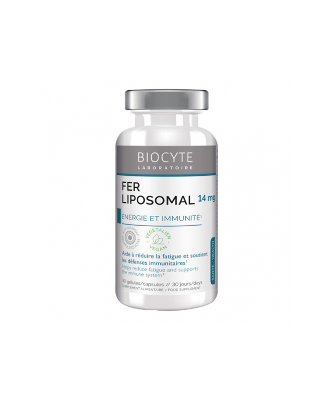 Biocyte Longevity Fer Liposomal est un complément alimentaire en gélules enrichi en fer, vitamine C et vitamine B12, conçu pour réduire la fatigue et soutenir le métabolisme énergétique.
